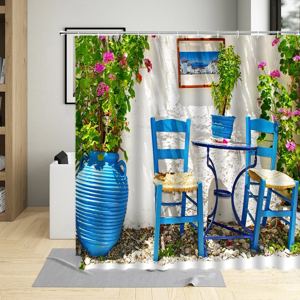 Традиционная греческая городская уличная занавеска для душа с цветами, сценическое синее окно, декор для ванной комнаты, Штора для ванной из полиэстера с крючками