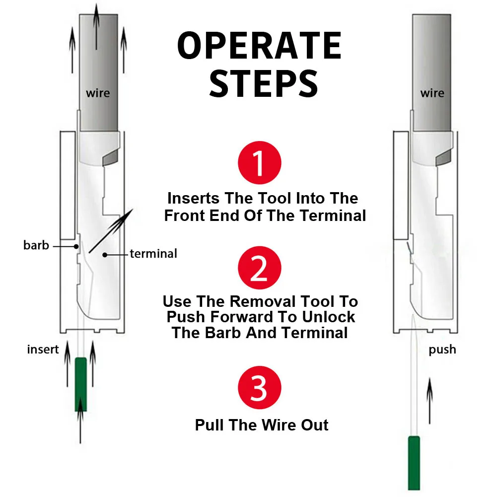 * Инструмент для удаления контактных терминалов может легко удалить Клеммную проволоку из соединителя жгута и добавить новые провода без каких-либо повреждений.