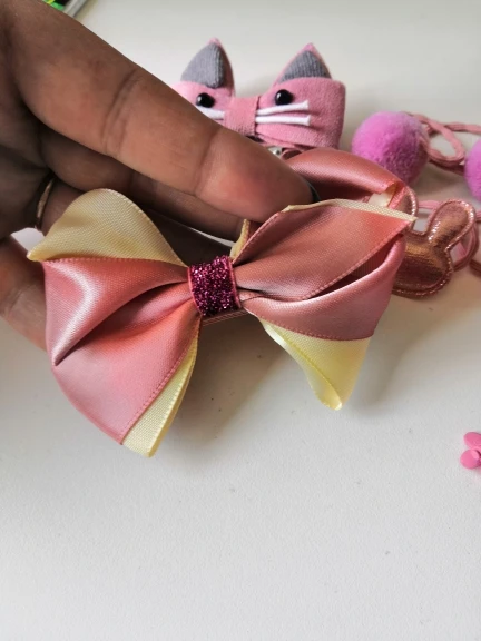Доставка быстрая, отслеживалась. Заколочки совсем маленькие, 2 шт средних размеров. Резинки - зайки приклеены очень слабо. Цвет ленты отличается.заколочка с розочкой вовсе и не розочка. Мелкие недоделки и местами клей виден.