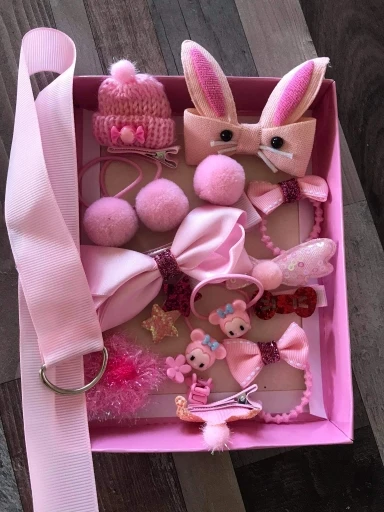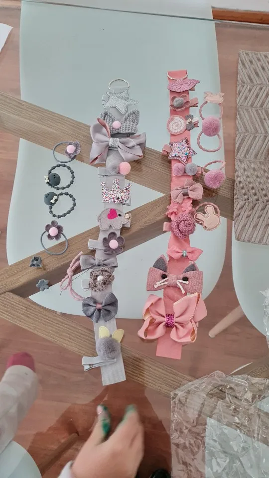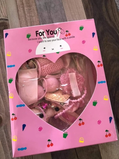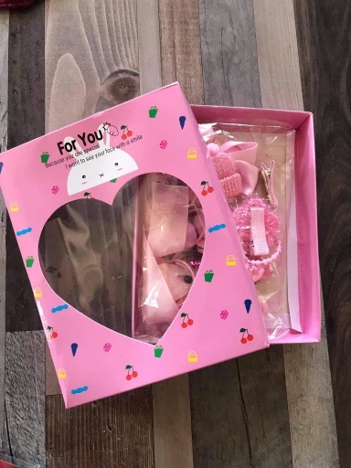 все заколки, бантики очень прикольные, но на фото все это в коробке, при получении товара её нет, имейте это ввиду. поэтому 4.