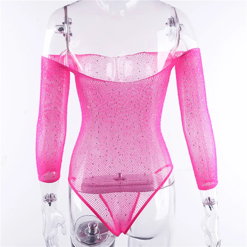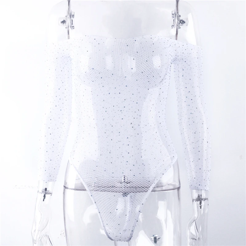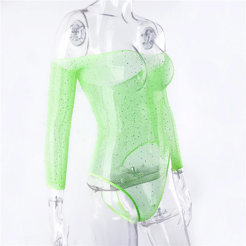 Женские блестящие стразы с вырезом лодочкой, сексуальное боди, сетчатый прозрачный Облегающий комбинезон с длинным рукавом и открытой спиной для клувечерние