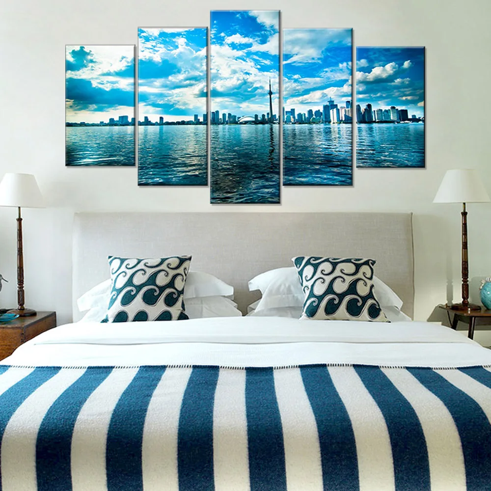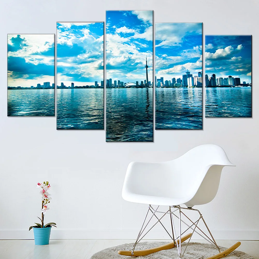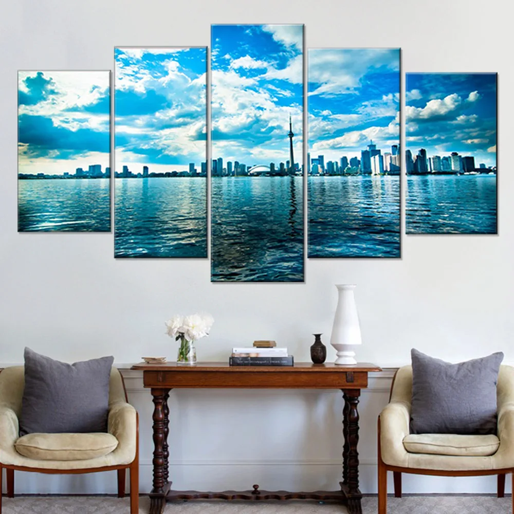 Картина на холсте, настенные художественные принты, 5 шт., картины Торонто, горизонт, озеро, голубое небо, башня, морской пейзаж, постер, декор для гостиной без рамки