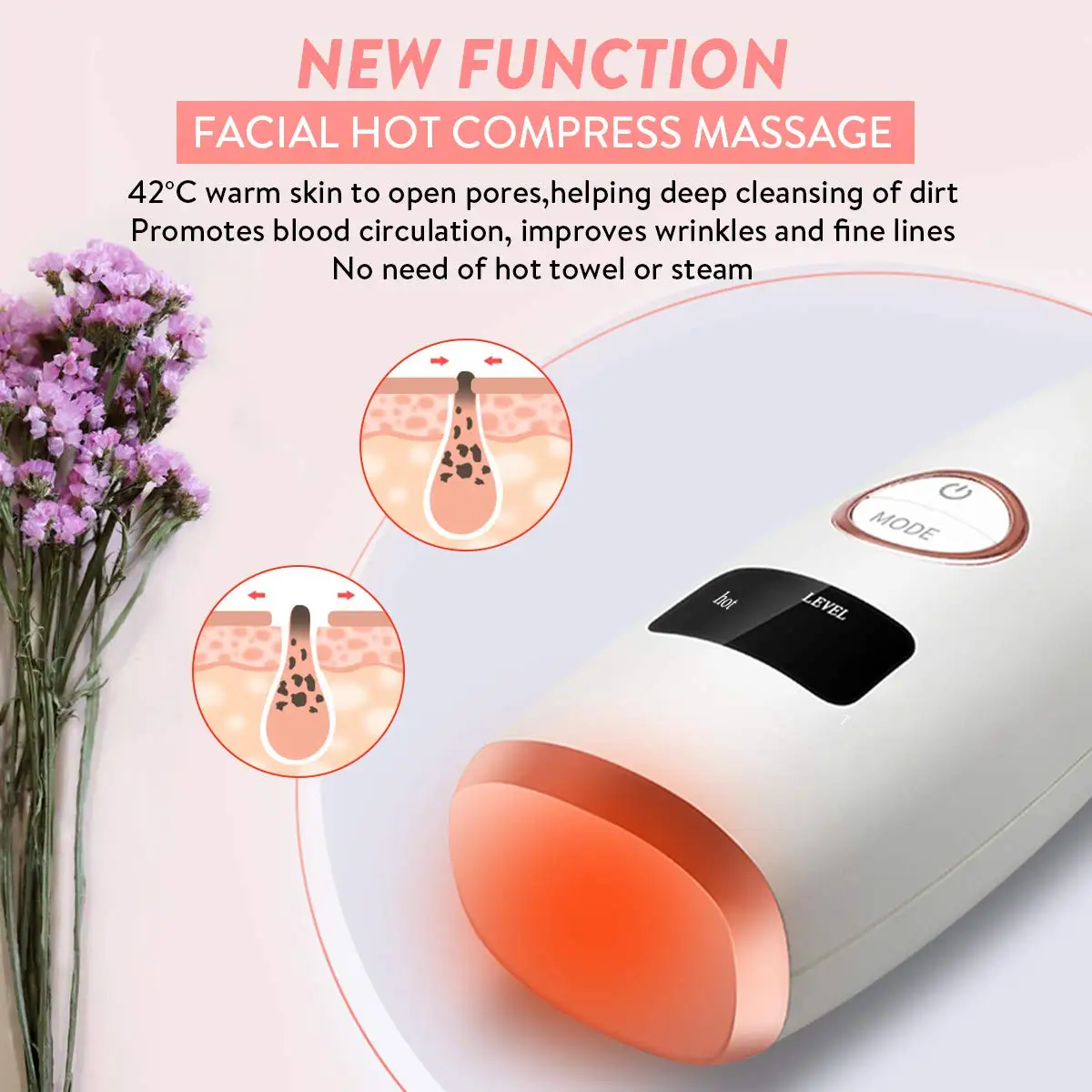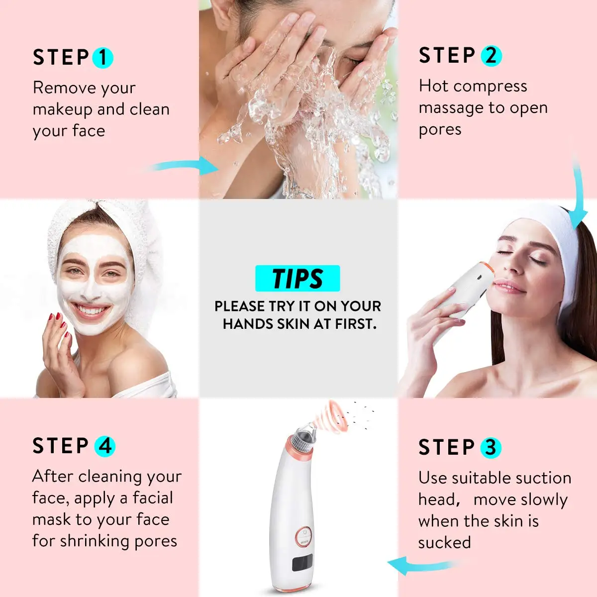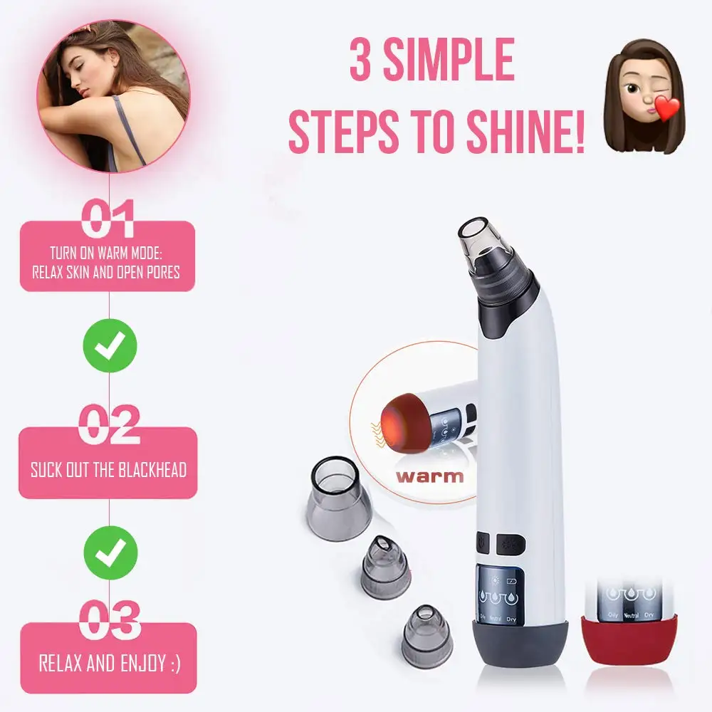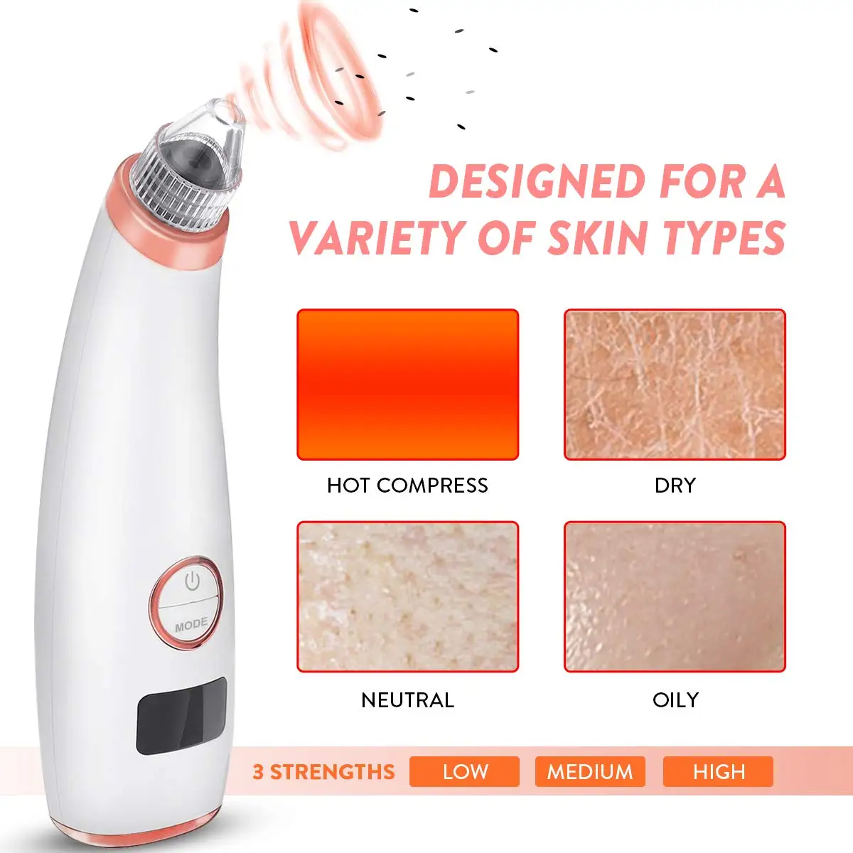 * Новая технология горячего и теплого ухода-Новейшее поколение инструмента для удаления черных точек имеет возможность более сильного всасывания и восстановления поврежденной кожи. Четыре узора-Функция горячего сжатия, чтобы открыть поры, лучше повысить измеритель угрей, чтобы очистить поры и грязь, чистый и тщательный