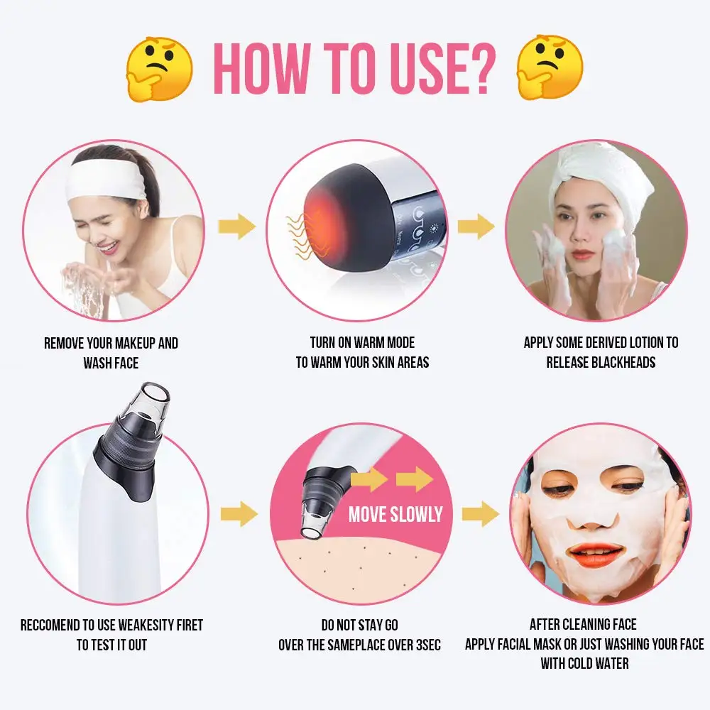 Шаг 3: Выберите интенсивность всасывания в вакууме для очищения пор и начните с самого низкого. Пожалуйста, не Оставайтесь на одном месте более 3 секунд, чтобы избежать синяков.