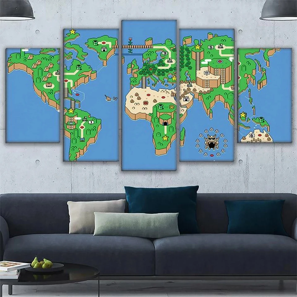 Настенные картины на холсте, домашний декор, каркас для гостиной, картины в стиле Super Mario из 5 предметов, модульные HD-принты, игровая Карта мира, плакат
