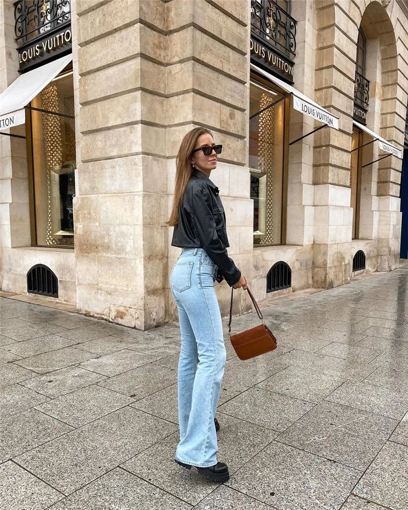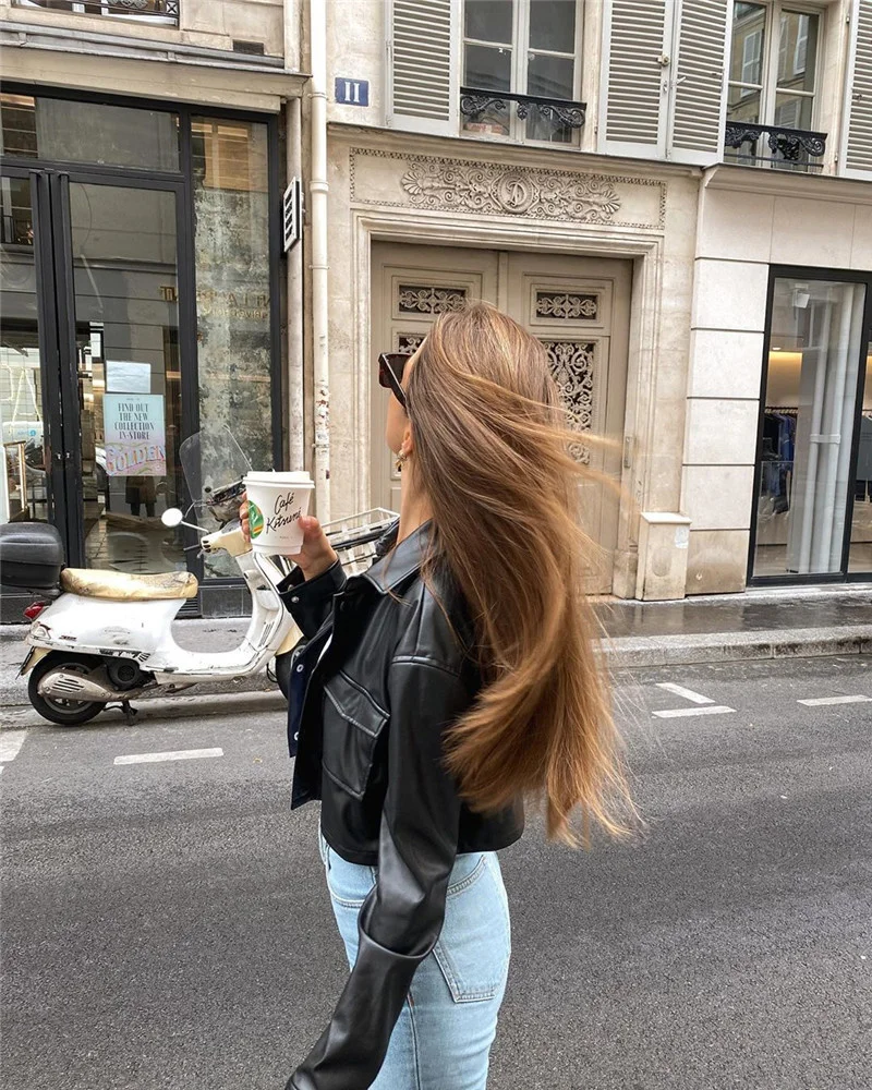 Куртка женская короткая кожаная с длинным рукавом, Свободный Повседневный жакет на пуговицах, с отложным воротником и карманами, черный цвет