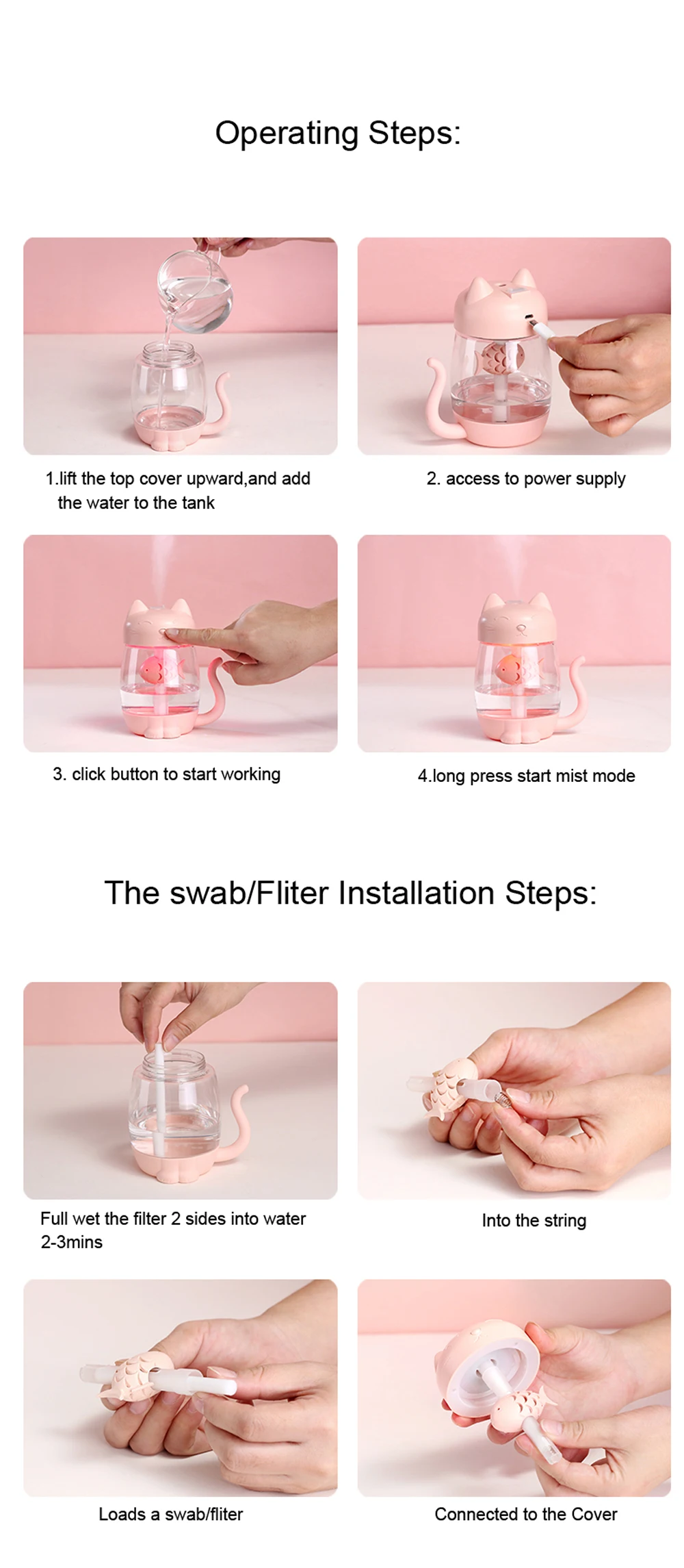 Милый мини увлажнитель воздуха для кошек 3 в 1 350 мл ультразвуковой увлажнитель холодного тумана с светодиодный светильник мини-вентилятор USB подходит для дома и офиса