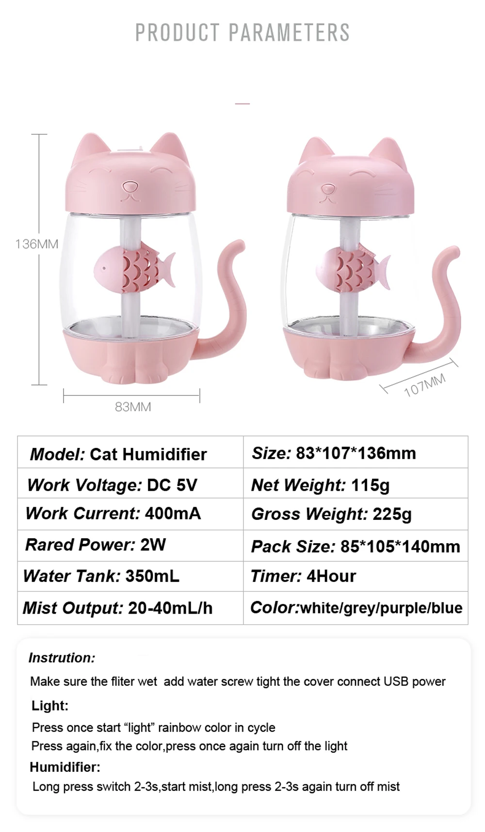 Симпатичный мини Cat увлажнитель воздуха 3 в 1 350 мл ультразвуковой холодный туман увлажнитель воздуха с светодиодный светильник мини-usb вентилятор подходит для Офис
