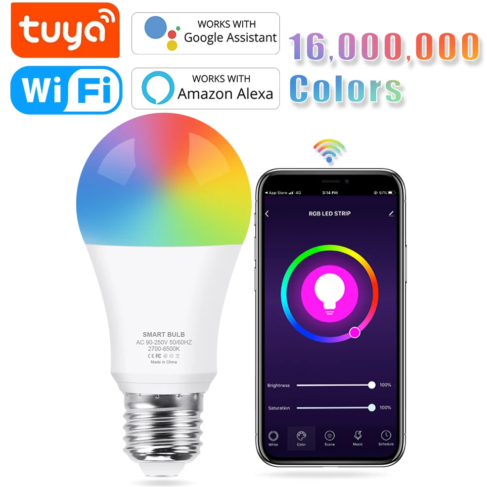 Умная Светодиодная лампа Tuya, Wi-Fi, голосовое управление, RGB, CW, изменение цвета, светодиодная лампа RGB, e27, лампа, дистанционное управление через приложение, совместимый с Alexa, Google Home