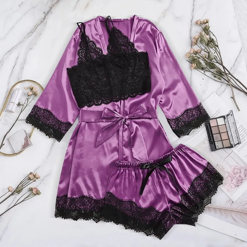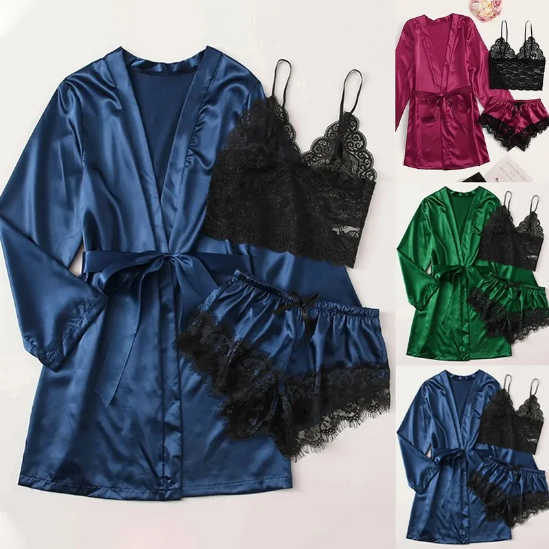 Шелковый халат, пижамный комплект, Женская кружевная атласная пижам...