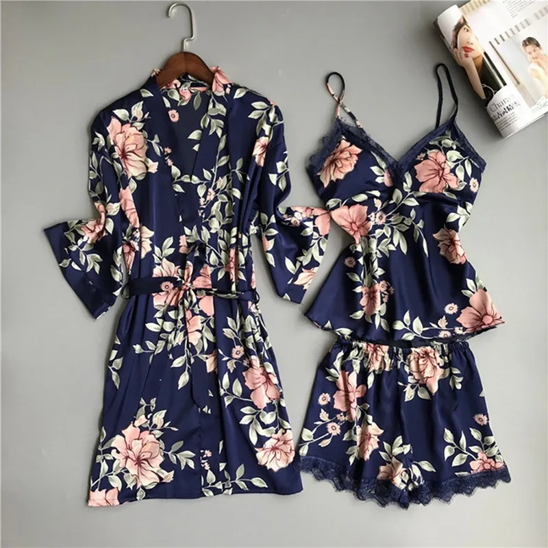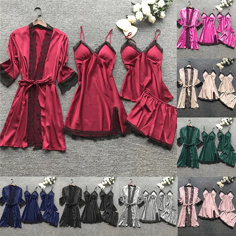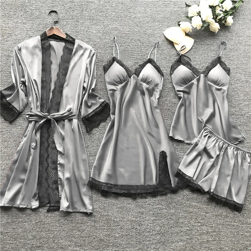 Женская одежда для сна из 4 предметов, шелковый халат, костюм для с...