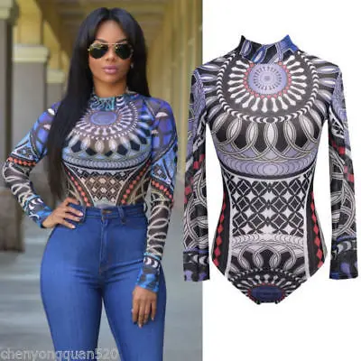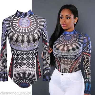 2021 новый сексуальный Для женщин татуировка с этническим принтом эластичные боди Прозрачная сетка прозрачный длинный рукав Топ Женская одежда для клуба с О-образным вырезом горловины Bodycon