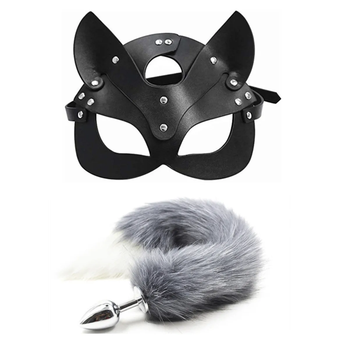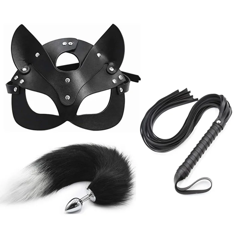 3 шт. косплей реквизит плеть маска кошки лисий хвост Анальная пробка Металл для ануса, Анальная пробка взрослые секс товары БДСМ женская кожаная маска для лица