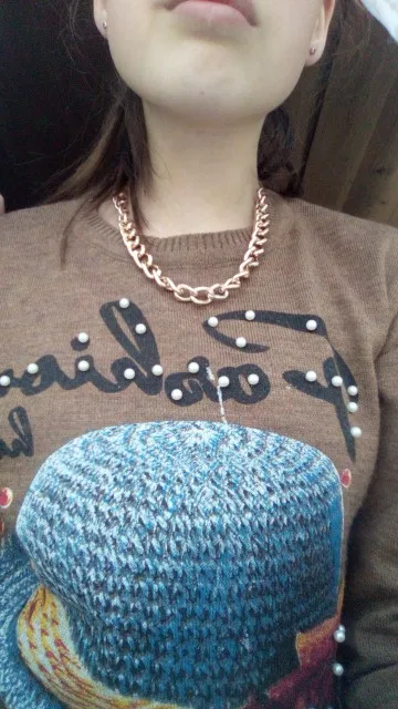 На мне сидит впритык к шее, как чокер. (Я обычного телосложения). В целом вещица симпатичная, надеюсь не потеряет свой блеск после первой носки. Своим деньгам соответсвует. Дошёл за месяц, с продавцом не общалась.