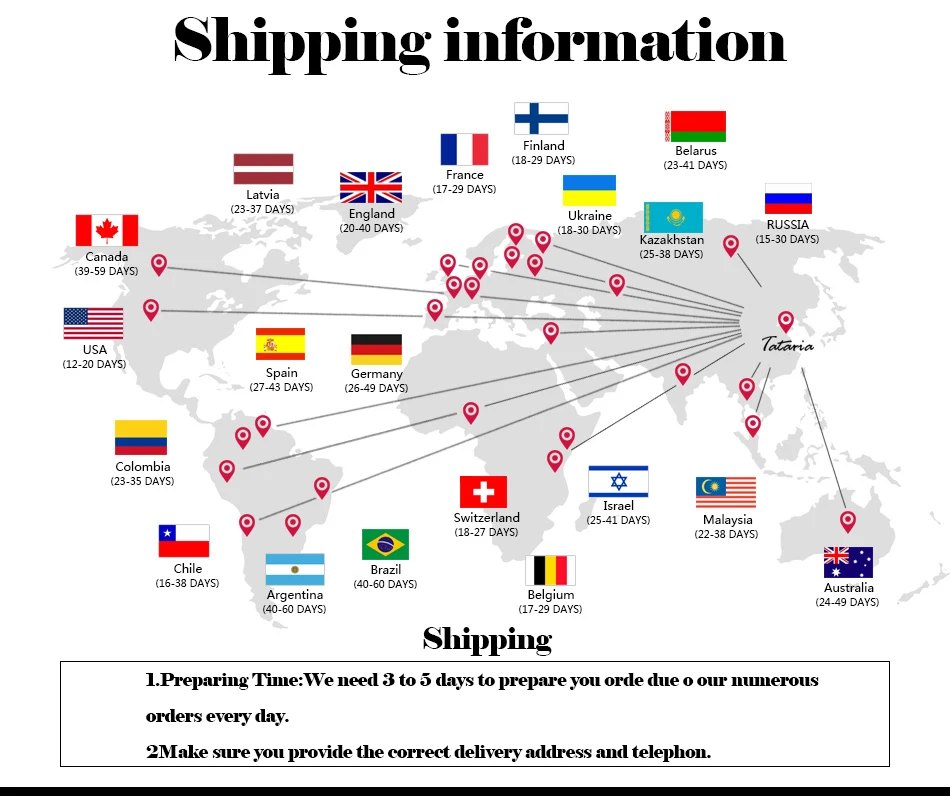 Как правило, мы отправим вам товары в течение 48 часов, как только получим вашу платежную информацию. Для того, чтобы поблагодарить за ваши заказы, мы будем регулярно отправлять хороший подарок всем нашим клиентамМы предлагаем буксировочные способы перевозки в общей сложности. Это AliExpress Стандартная доставка и авиа-отправление Почты Китая. Мы отправим Вам посылки в соответствии с вашим запросом. Бесплатная доставка по всему миру авиа-отправление Почты Китая.Если ваш заказ превышает 15 ems, вы можете получить быстрый бесплатный EMS или DHL в качестве способа транспортировки в нижеуказанные страны!(США, Великобритания, Канада, Австралия, Новая Зеландия, Сингапур, Филиппины, Южная Корея, Бруней, Тайвань, Малайзия, Таиланд, Япония, Германия, Бельгия, Великобритания, Франция, италия, Люксембург, Голландия, Сан-Марино, Австрия, Дания, Финляндия, Греция, Гернси, Ирландия, Джерси, Норвегия, Португалия, Испания, Швеция, Швейцария, Болгария, Кипр, Эстония, Латвийский, литовский, Мальта, Словакия, Словения, Чехия, Венгрия, Польша, Румыния)