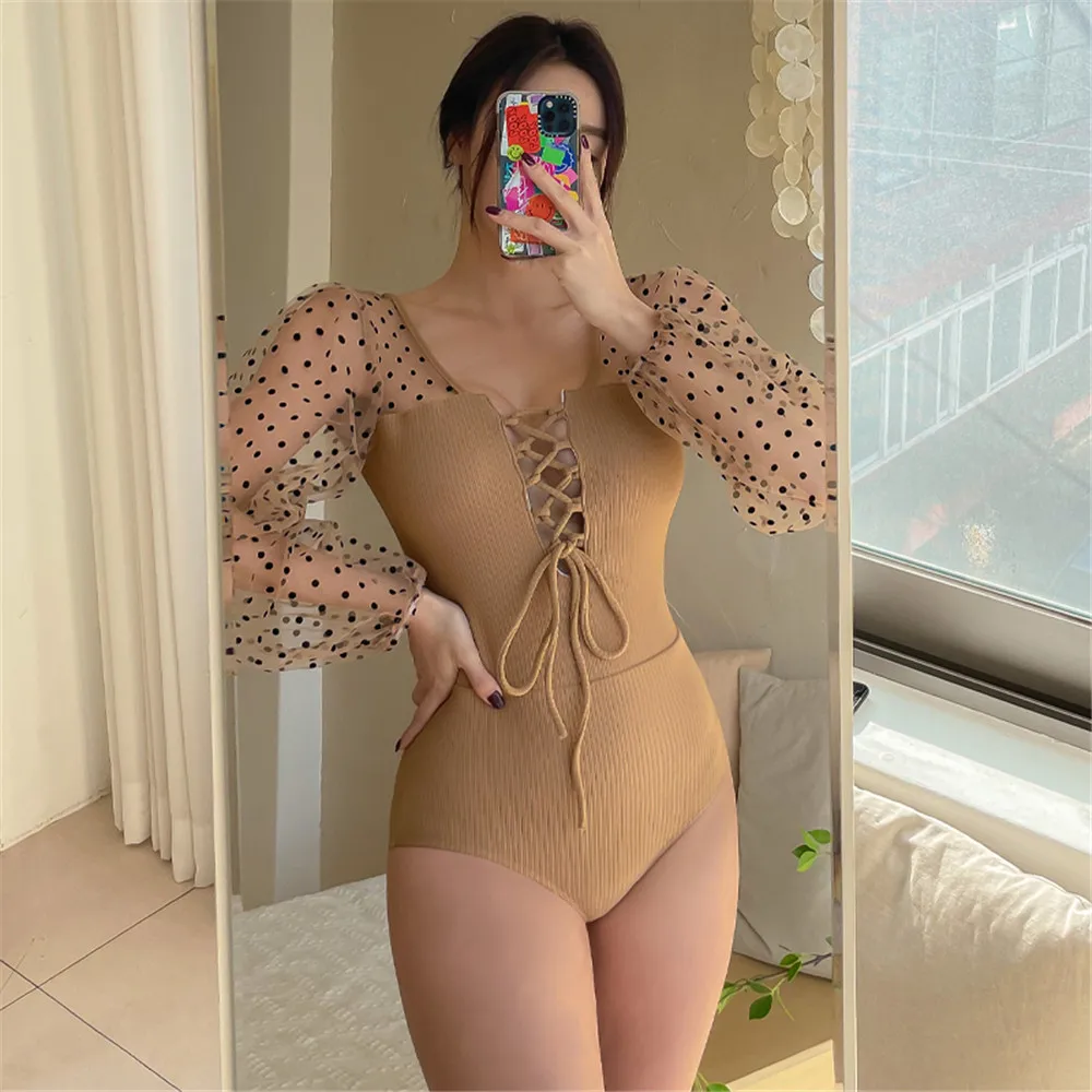 Цельный купальник с длинным рукавом, женская одежда для плавания в горошек, кружевное Монокини, бандажный купальник, трикини в Корейском стиле, купальный костюм на шнуровке