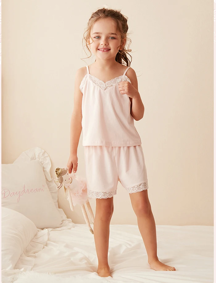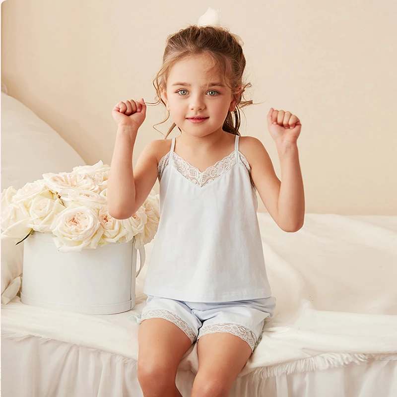 Милая Детская одежда; Летние комплекты одежды для сна; Пижамы на бретельках для девочек; Детская домашняя одежда принцессы с кружевом; Пижамные комплекты для маленьких девочек