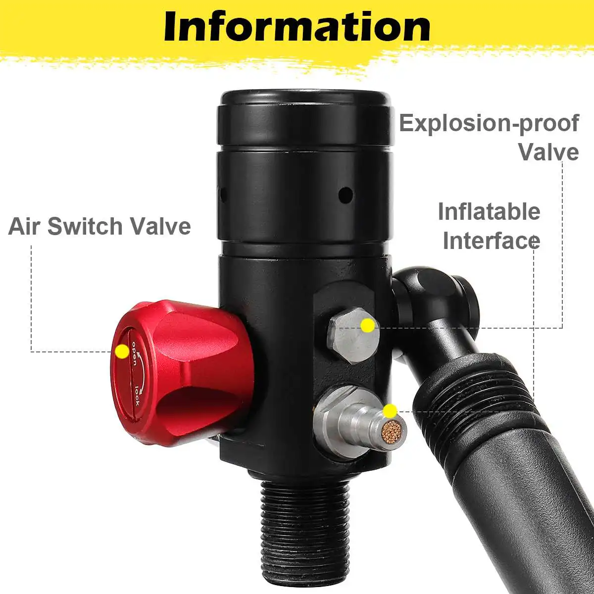 Особенности:-Компактный портативный легкий, легко носить с собой.-Дышите подводным плаванием с полной свободой.-Изготовлен из авиационного алюминиевого материала и соответствует стандартам производства Дайвинг-оборудования.-Дыхательная насадка изготовлена из пищевого силикона, который безопасен и не имеет запаха.-Манометр обладает световой функцией, а вода все еще чистая на 80 метров. Изготовлен из нержавеющей стали, водонепроницаемый, устойчивый к коррозии, высокой твердости и долговечный.