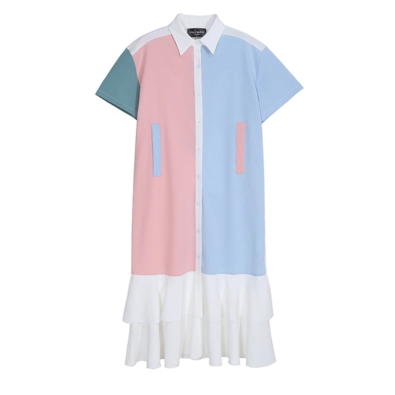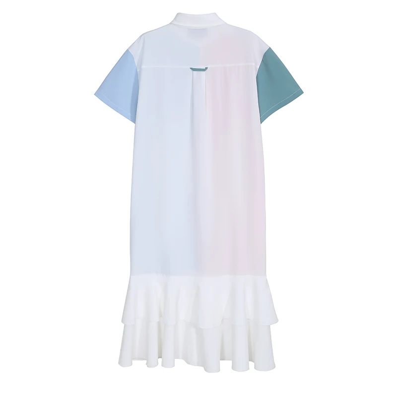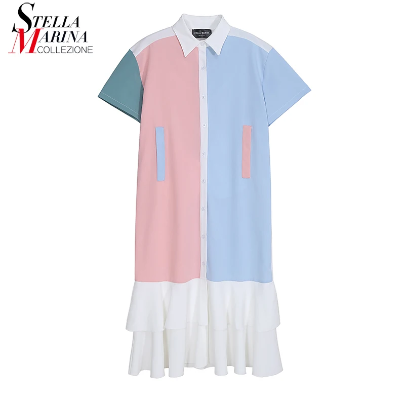 Новинка 2021, хит, цветное, лоскутное, дизайнерское, женское, летнее, прямое, миди, платье-рубашка с оборками, женское, милое, повседневное, женское платье, стиль 8223