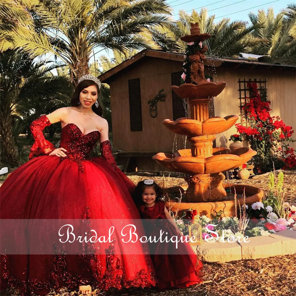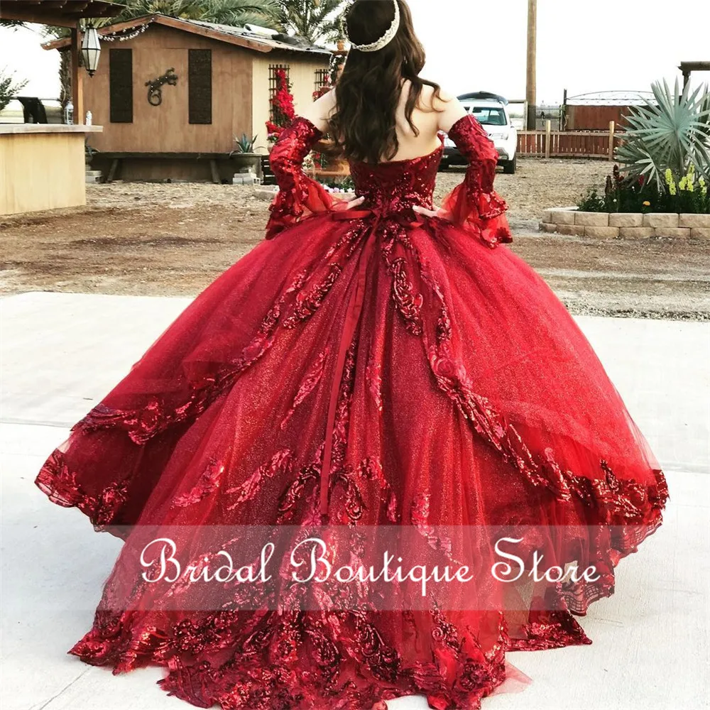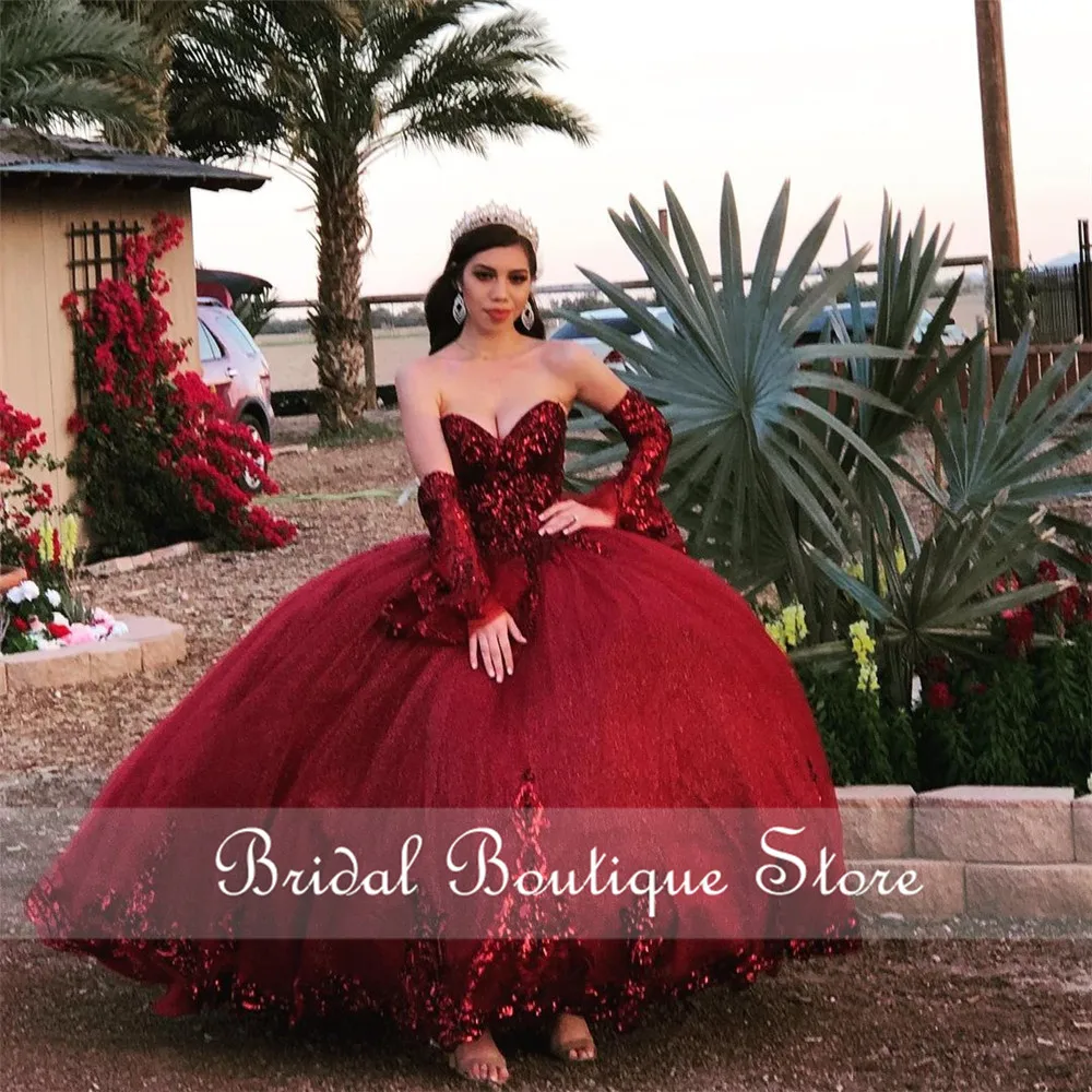 Органза цвета Бургунди сладкий 16 Пышное Платье Холодное торжество, расшитое пайетками; С длинными рукавами и аппликацией из бисера Милая Праздничное платье мексиканская для девочек платье на день рождения
