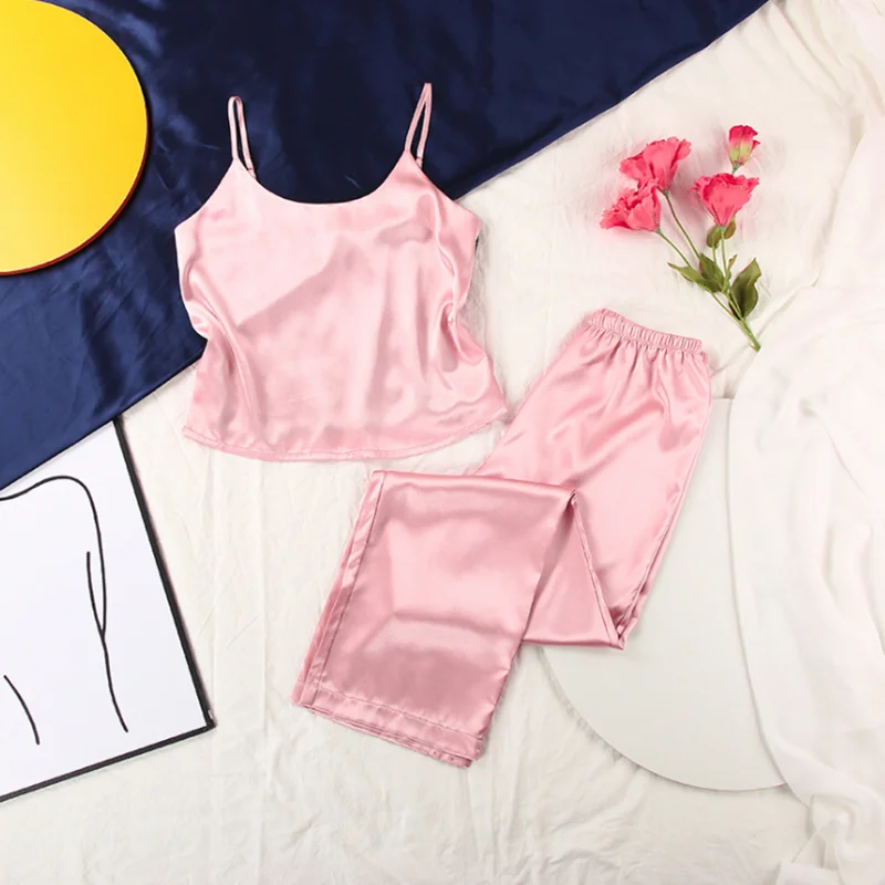 Пижама женская атласная с открытой спиной, пикантная кружевная ночная рубашка со штанами, ночная рубашка без рукавов, свободное нижнее белье, одежда для сна