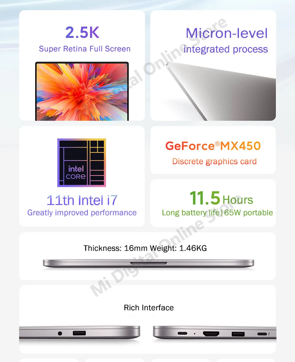 Ноутбук Xiaomi RedmiBook Pro 14, ноутбук 11th Intel i7-1165G7i5-1135G7 MX450 16 + 512 ГБ, экран 14 дюймов 2,5 K, разблокировка по отпечатку пальца