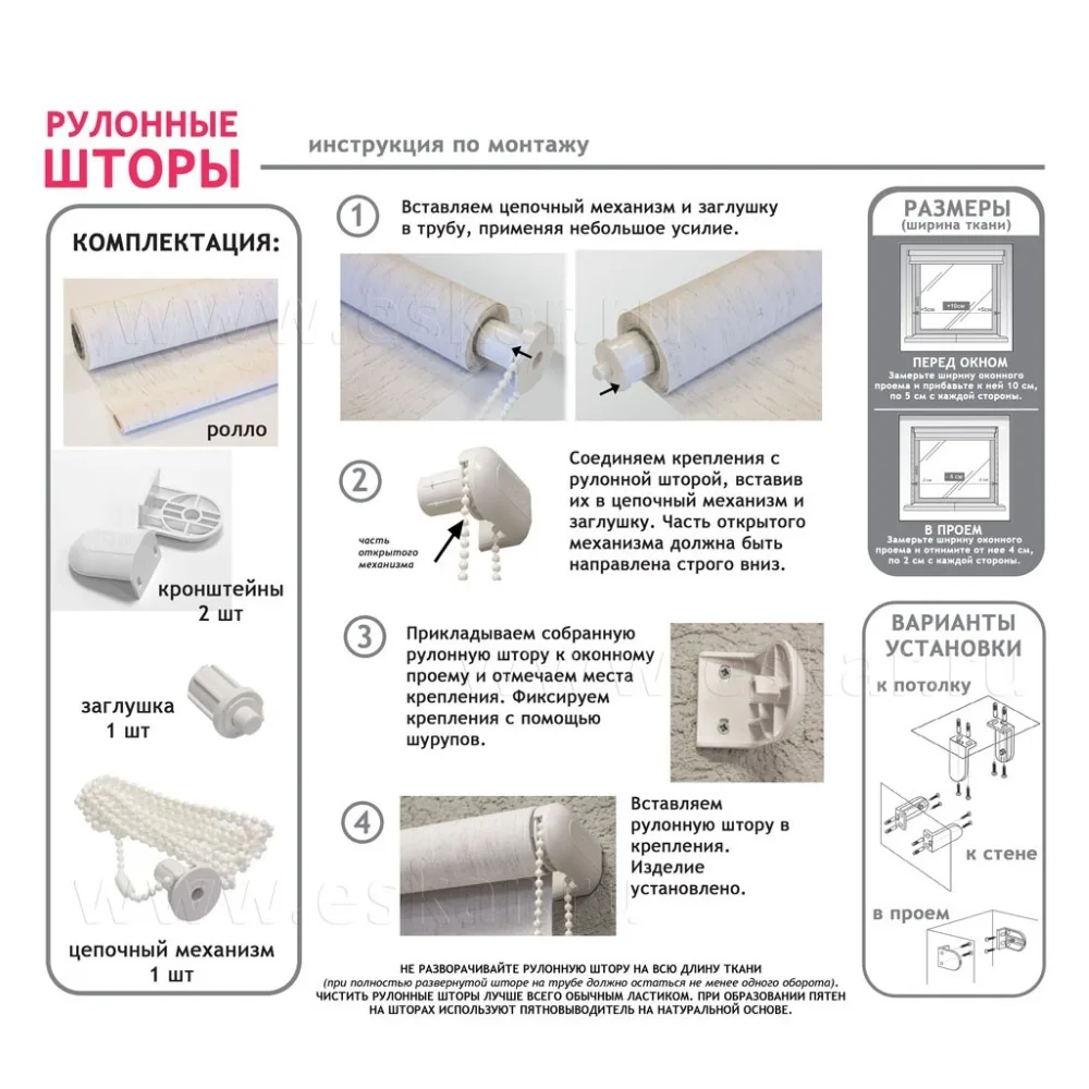 Монтажный комплект: липучка для фиксации нижнего края шторы; крепления без сверления: для открывающихся створок - при помощи клипс; для глухих - на 2-ий скотч.