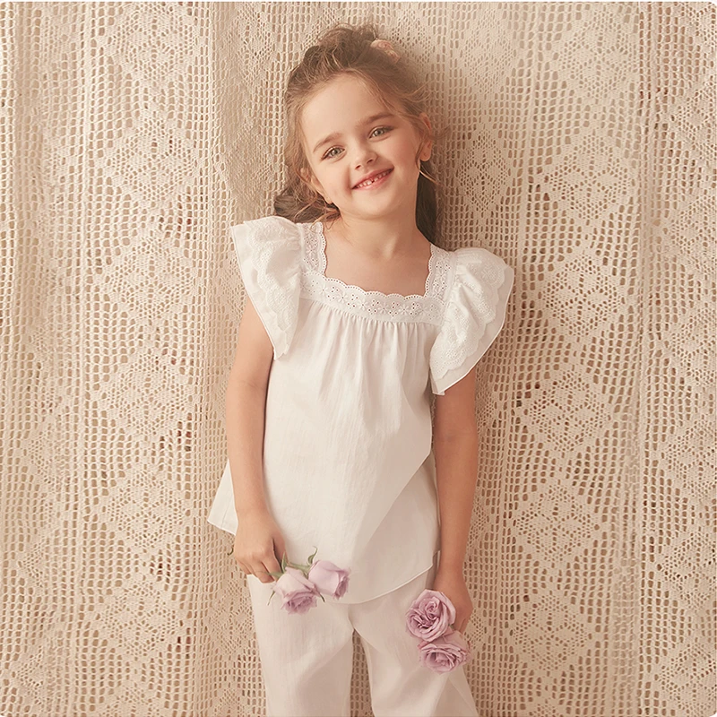 Пижамный комплект принцессы с коротким рукавом для девочек. Винтажная кружевная Пижама с квадратным вырезом для малышей. Летняя детская одежда