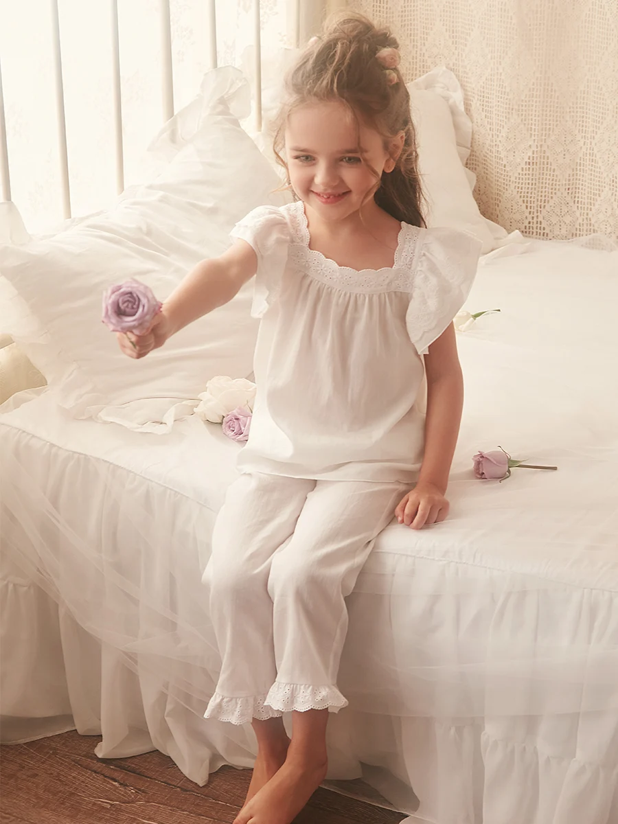 Пижамный комплект принцессы с короткими рукавами для девочек, Винтажный кружевной пижамный комплект с квадратным вырезом для малышей, одежда для сна, летняя детская одежда