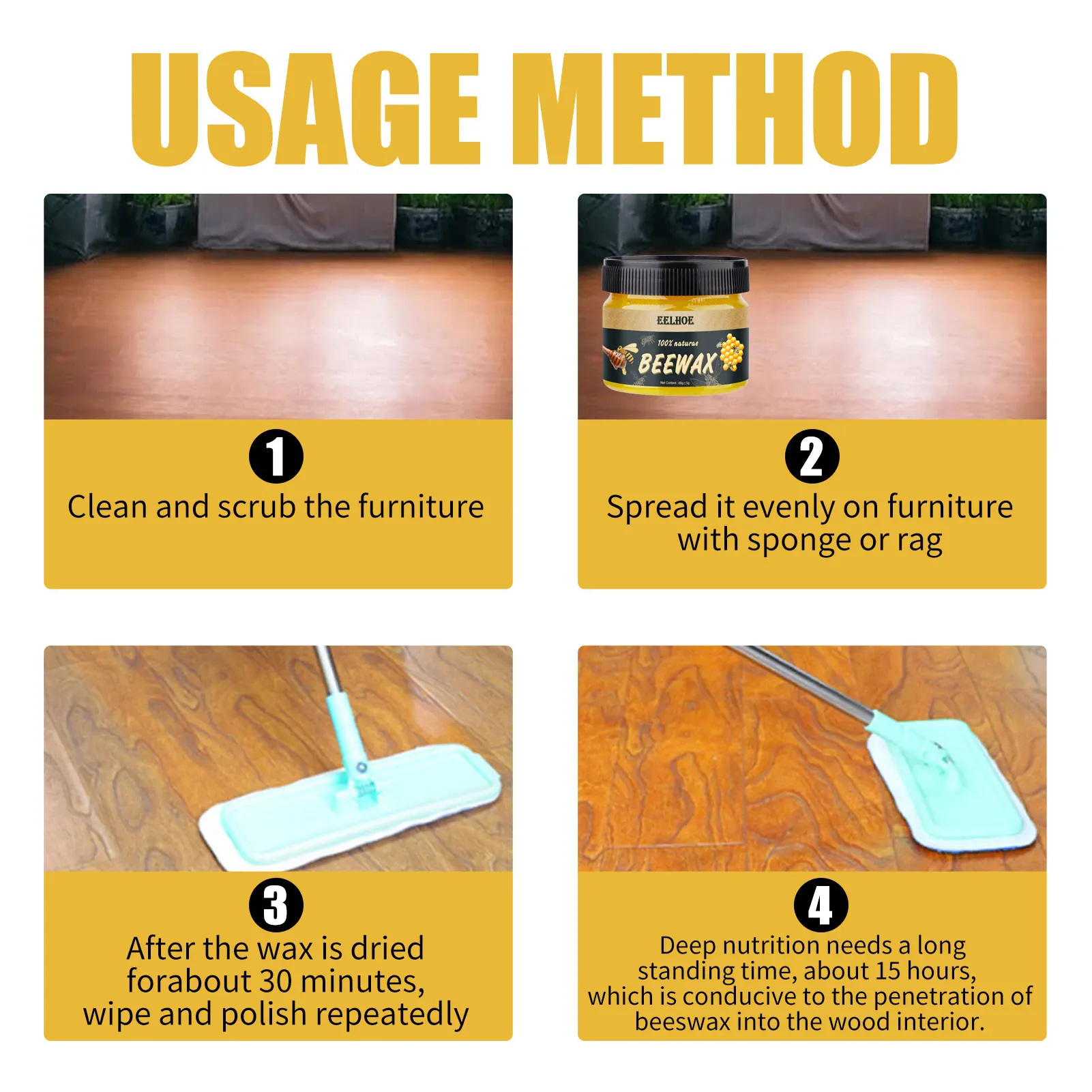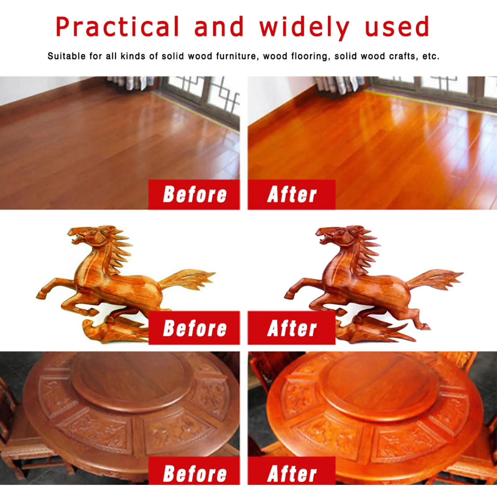 1. Безопасно для использования: безопасно для использования на всех типах обработанной древесины.2. Восстановите внешний вид мебели: очистите грязь, восстановите внешний вид старой мебели.3. Чистый и полированный: Этот универсальный полировальный пчелиный воск может не только очистить вашу деревянную мебель и деревянные шкафы, но и полировать их, чтобы они светились естественным образом!4. Освежающий медовый аромат: пчелиный воск имеет медовый аромат, и он пахнет освежающим и чистым после каждого использования.5. Широкое Применение: подходит для деревянной мебели, тика, антикварной или современной мебели, столов, стульев, полов, скамеек и т. д.