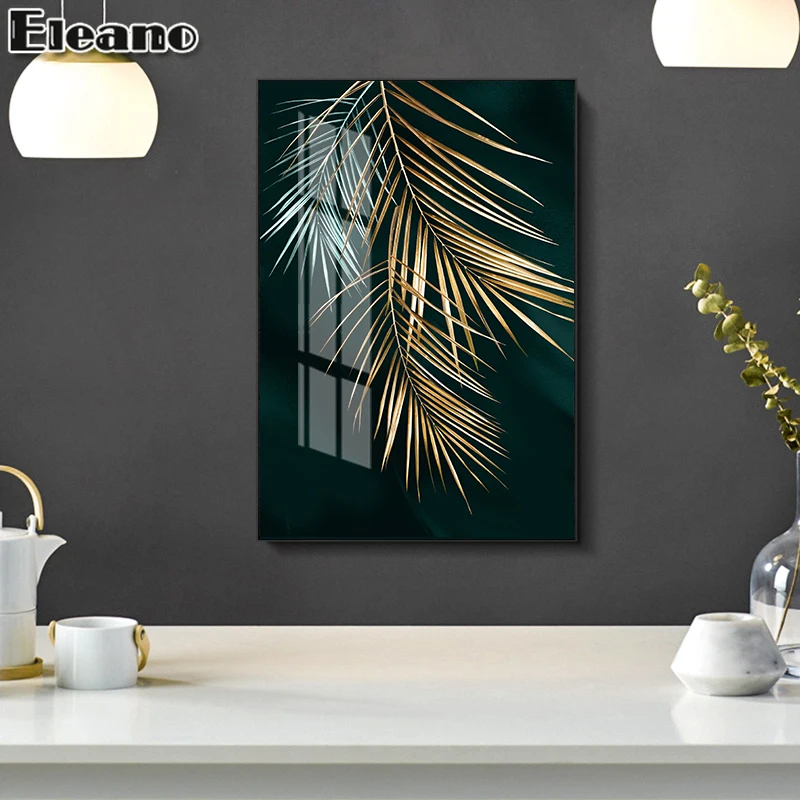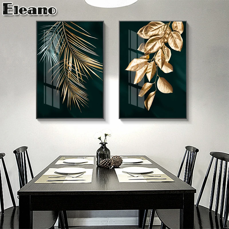 Картина на холсте для гостиной, с изображением темно-зеленых золотых больших листьев, роскошная настенная абстрактная картина, современные декоративные картины