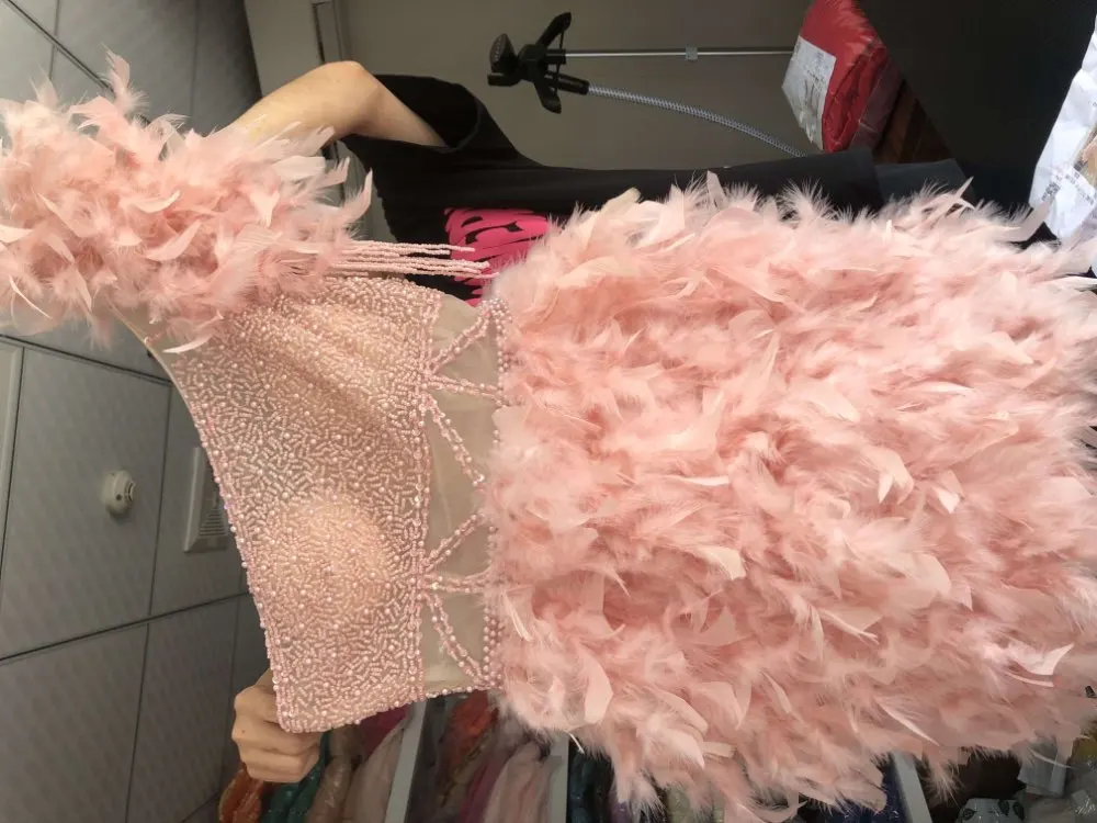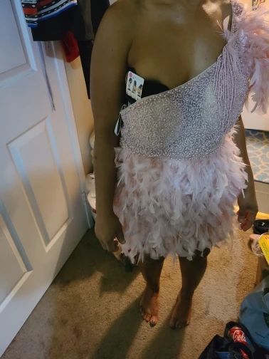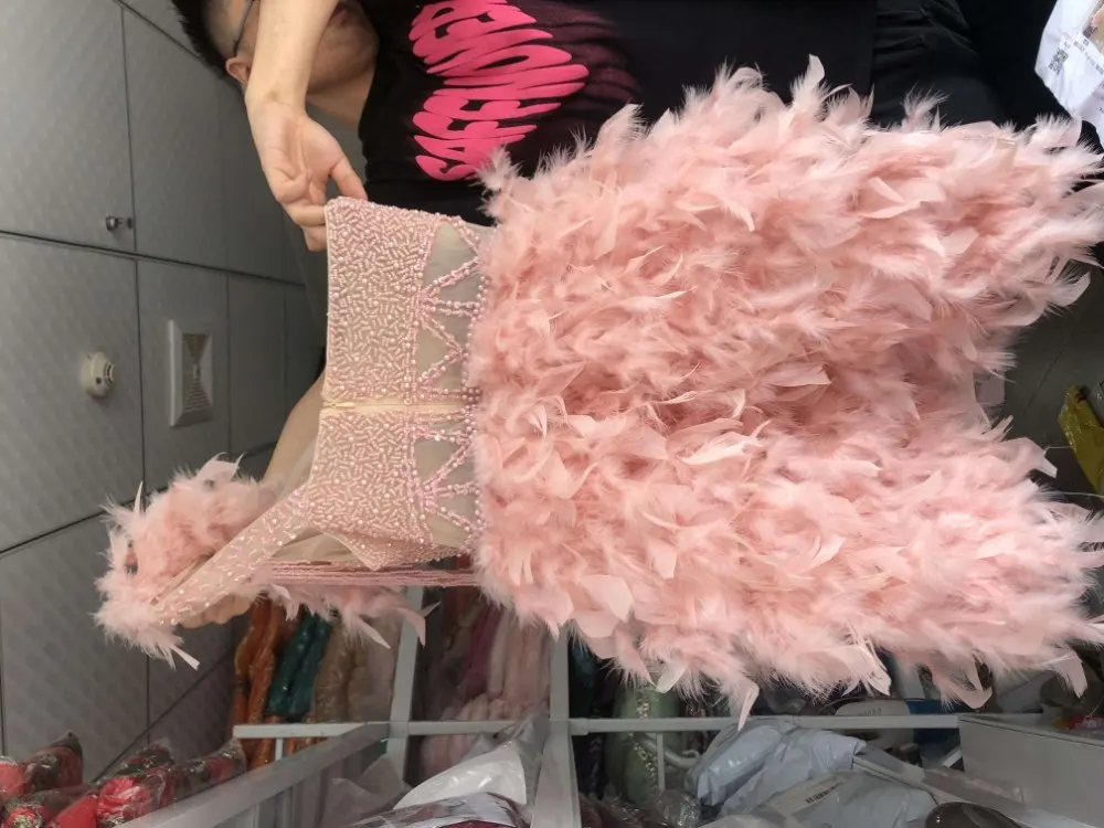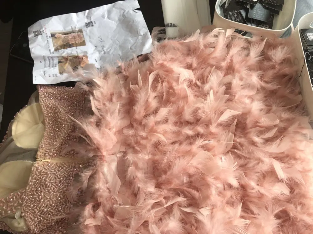 dress is of very cheap materials and the cost of the dress is not reflective of the dress, I will never biy from this store, I regreted 8t very much, a dress that cost USD 156 is not worth prize, very cheap material and poorly done, infact the feathers are falling apart. Is nit true to size.