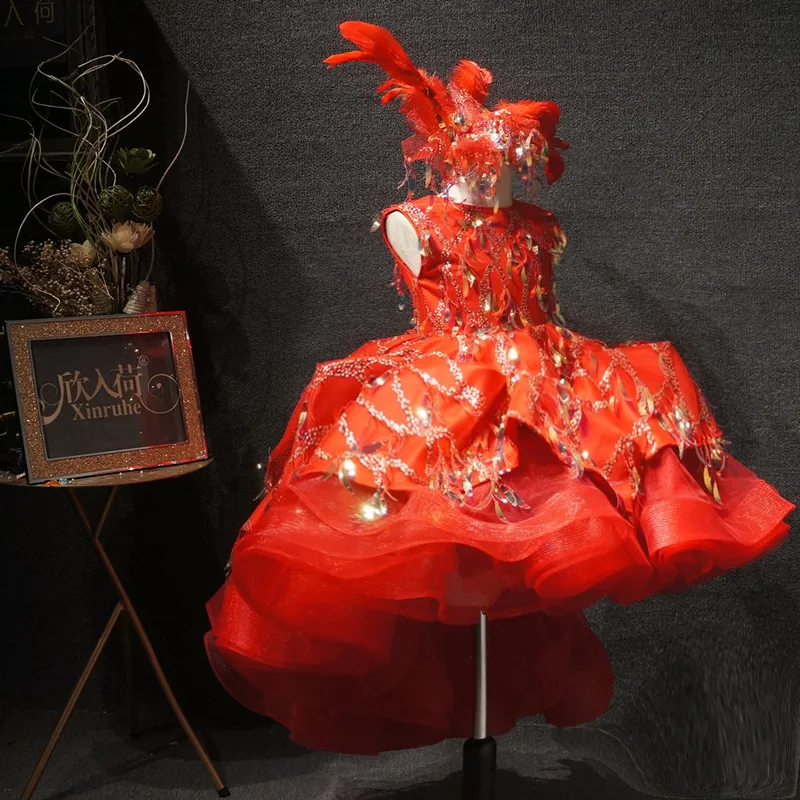 Реальное изображение и серебряного цветов; Блестящая Висячие серьги для девочек красный Платья для праздников и дней рождения красного цвета для маленьких девочек сначала юбка-пачка для причастия платья перо головной убор