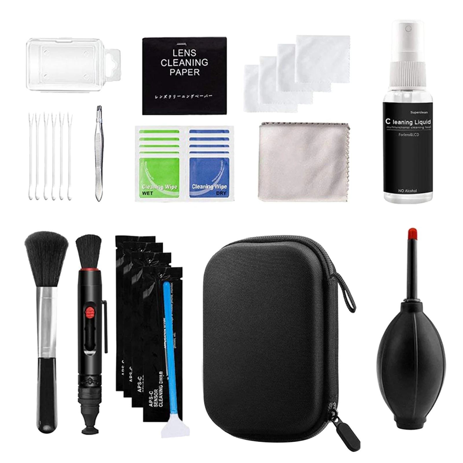 Профессиональный набор для чистки камеры-используется для очистки жира, отпечатков пальцев, пятен и грязи на объективах камер, микроскопах, телескопах, очках и других прецизионных оптических линзах.Сенсорные чистящие тампоны-поглощают и удаляют невидимые частицы и грязь. Совместим с датчиком APS-C.Однокорпусный воздуходувка-воздуходувка будет направлять воздушный поток, чтобы сдуть грязь и пыль с объектива или датчика камеры.Жесткий защитный чехол-Уберите все чистящие наборы и другие аксессуары и Защитите их, чтобы избежать случайных столкновений на открытом воздухе.Двухсторонняя ручка для чистки линз-этот инструмент имеет щетку для пыли с одной стороны и специальный не жидкий чистящий элемент с другой стороны, который предназначен для того, чтобы никогда не высыхать. Обратите внимание, что небольшое количество тонера на головке чистящей ручки не пачкается