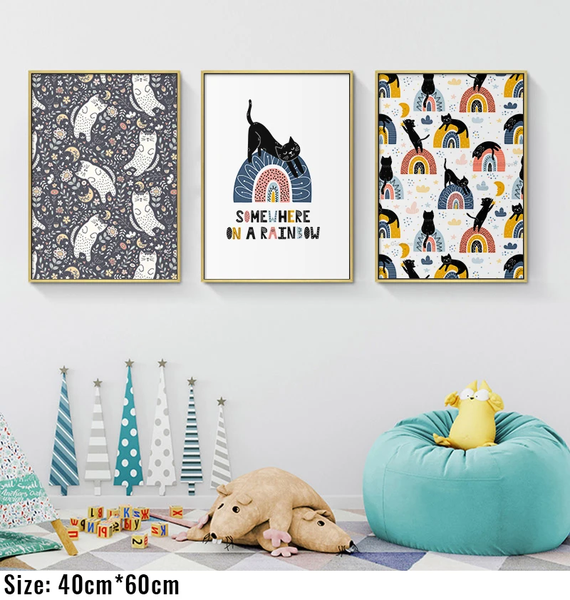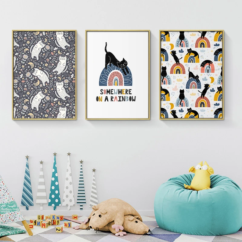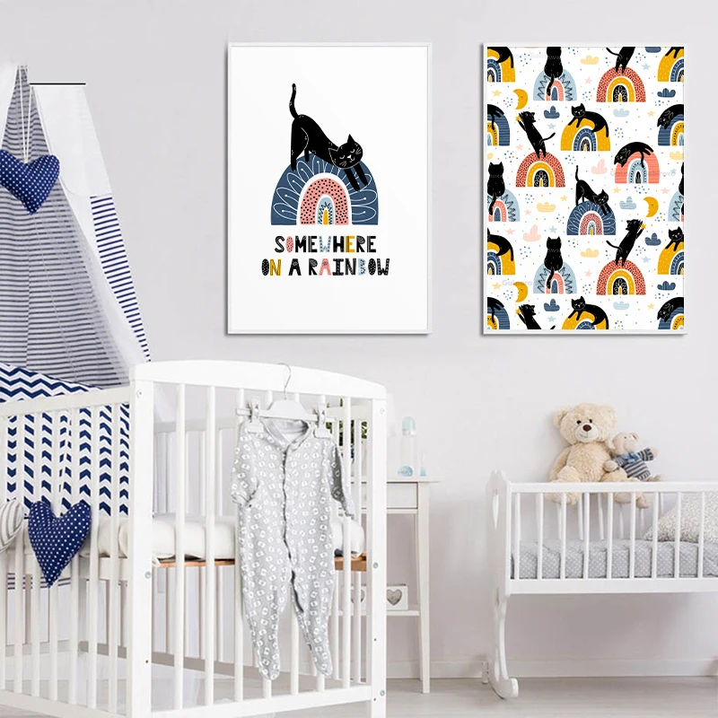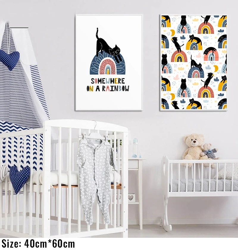 Милый спящий Кот и постер с радугой, холст, картина для детской стены, художественный принт для детской спальни, скандинавский домашний декор