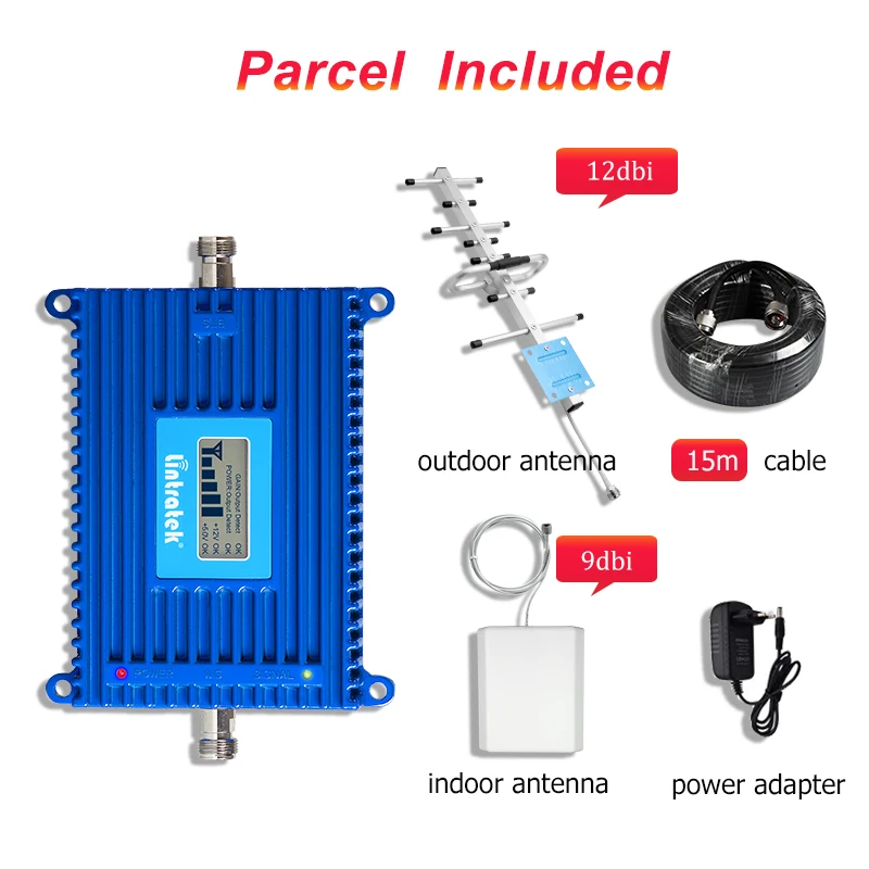 Lintratek 70dB Одноместный бустер × 1Внешняя антенна yagi × 1 (12dbi)Внутренняя панельная антенна × 1 (9dbi)Кабель 15 м × 1 (N папа)Блок питания × 1 шт. (5V 2A)Лента × 1 шт.