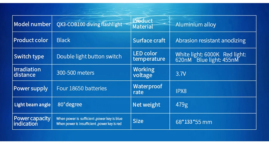 * Светильник Тип чашки: износостойкие стеклянные линзы* Материал изделия: авиационный алюминиевый сплав* Белый светильник Цветовая температура: 5700K* Красный светильник Длина волны: 620 нм* Синий светильник Длина волны: 455 нм* Угол луча: 120 градусов* Водонепроницаемость: IPX8* Светильник угол: 80 градусов* Тип переключателя: ламповый пресс-переключатель* Обработка поверхности: трёхуровневое жесткое анодирование* Красный светильник: 50 лампочек (3000 люменов)* Параметры Blu-Ray: 40 лампочек (2800 люменов)* Белый светильник: 1 * COB лампа (6000 люмен)* Ассортимент продукции: 300-500 метров* Характеристики аккумулятора: 4*18650 (опционально)• Рабочее напряжение: 3,7 V* Цвет изделия: черный* Вес нетто продукта: 479 г* Водонепроницаемость: 80 метров под водой* Размер изделия: длина 133 мм, диаметр держателя лампы 68 мм, диаметр хвоста 55 мм