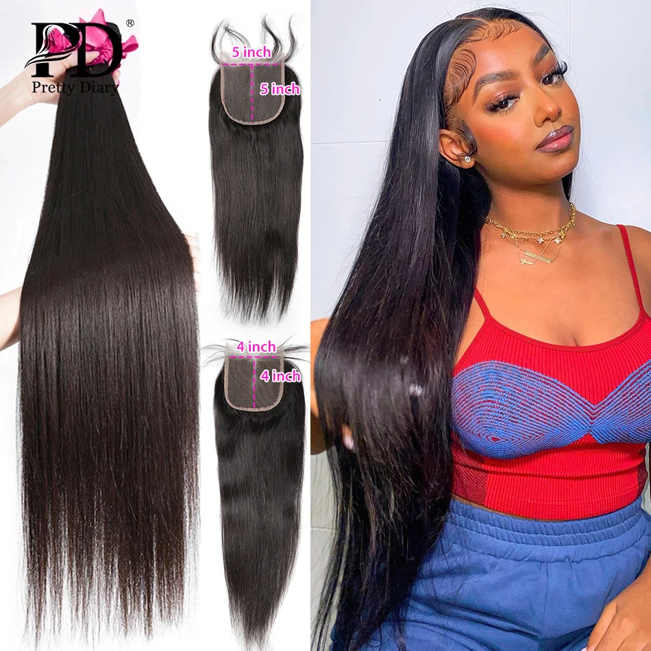 Прямые бразильские волнистые пряди волос с закрытием 28 30 дюймов 3 4 пряди человеческих волос с закрытием фронтальной