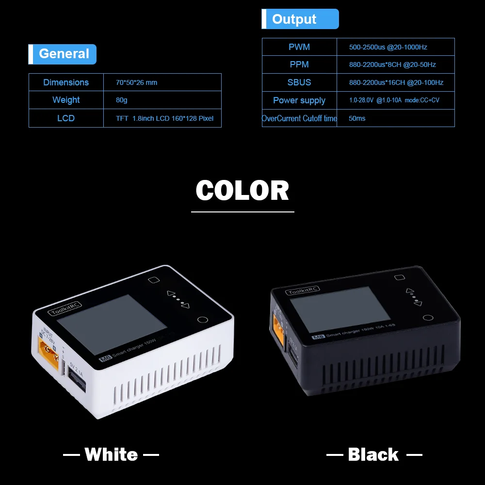 M6-это самый маленький в мире цветной экран мощностью 150 Вт! С зарядным устройством 150 Вт и 10 а в центре M6 также имеет серводвигатель, контролер, счетчик ватт, PWM/PPM/Sbus входные тестеры и выходные генераторы вместе с переменным напряжением и контролем выходного напряжения постоянного тока.