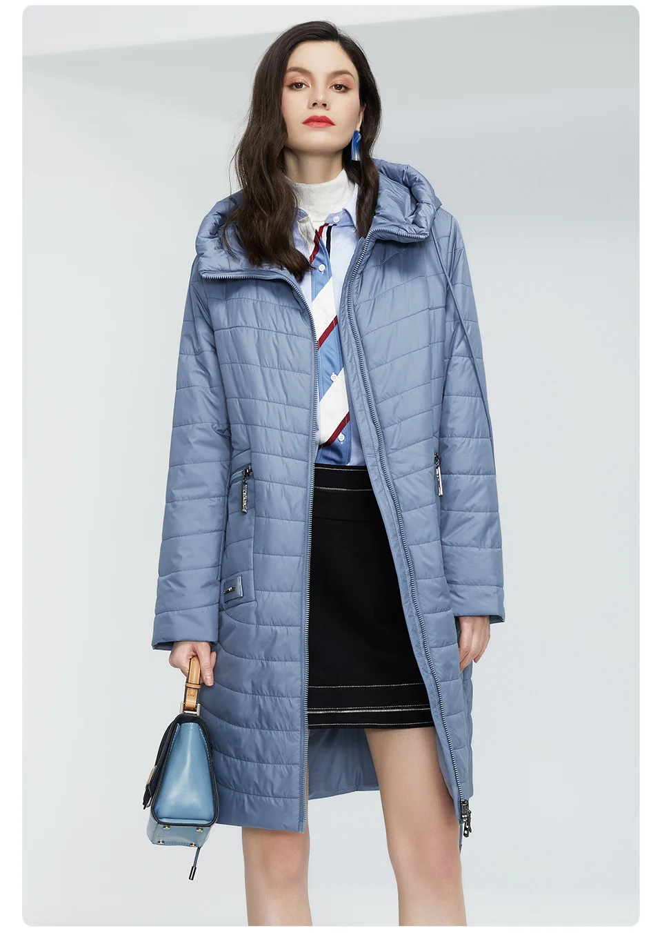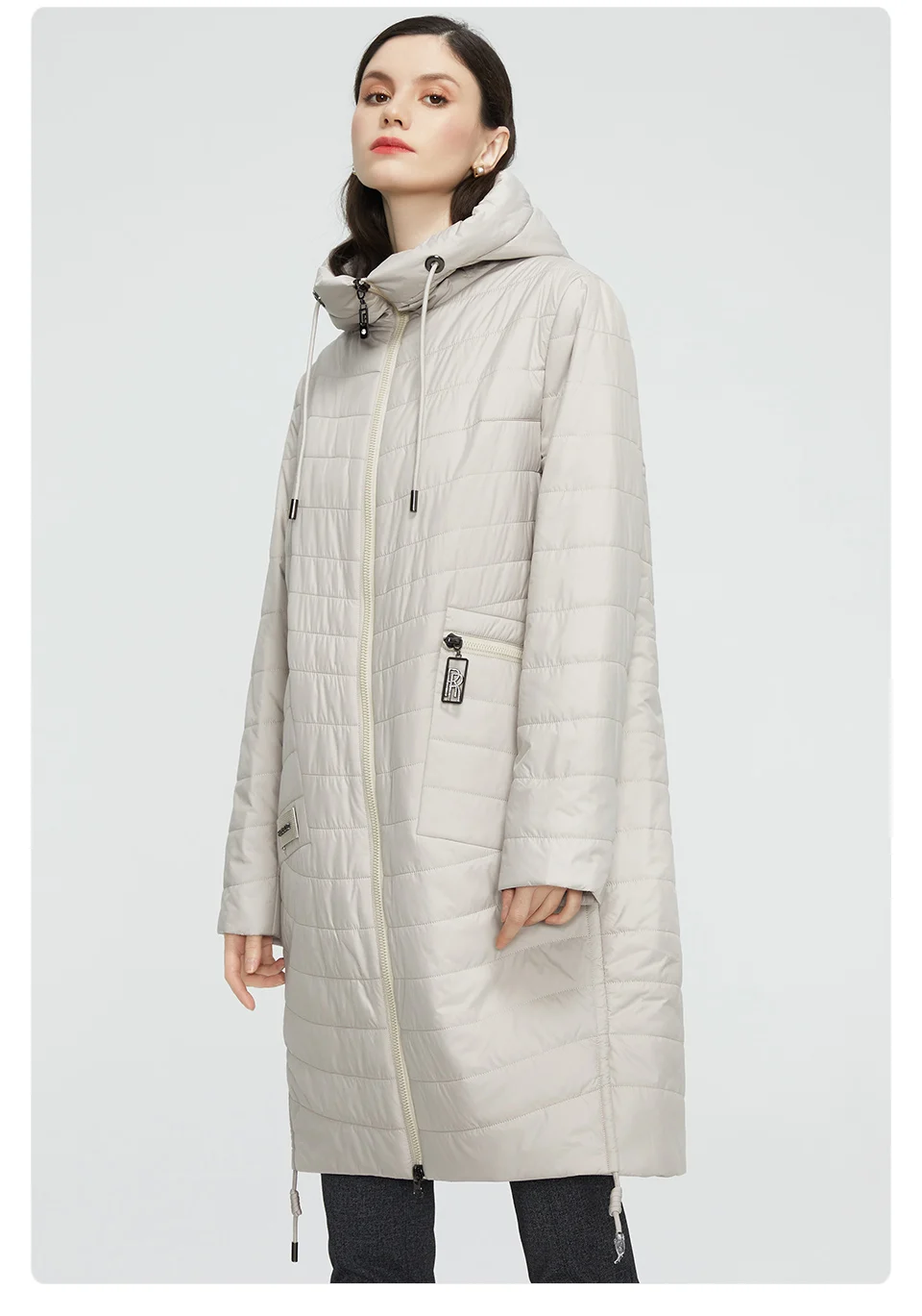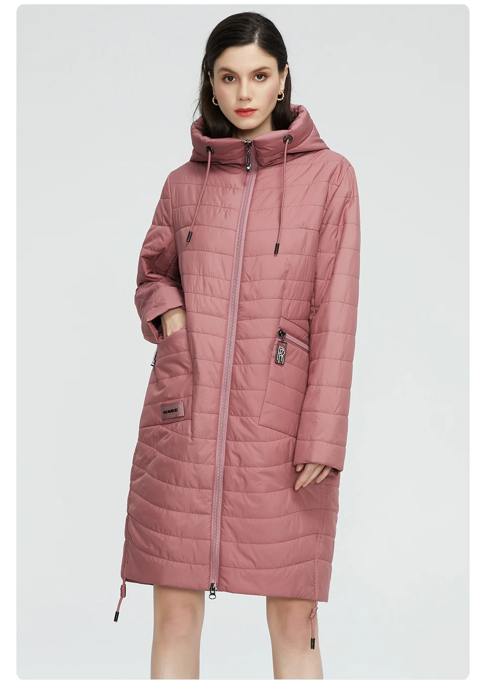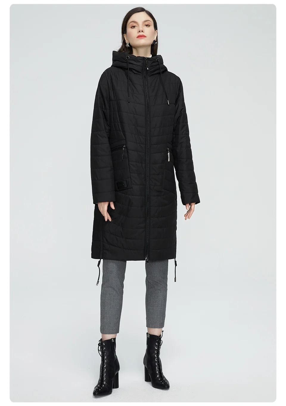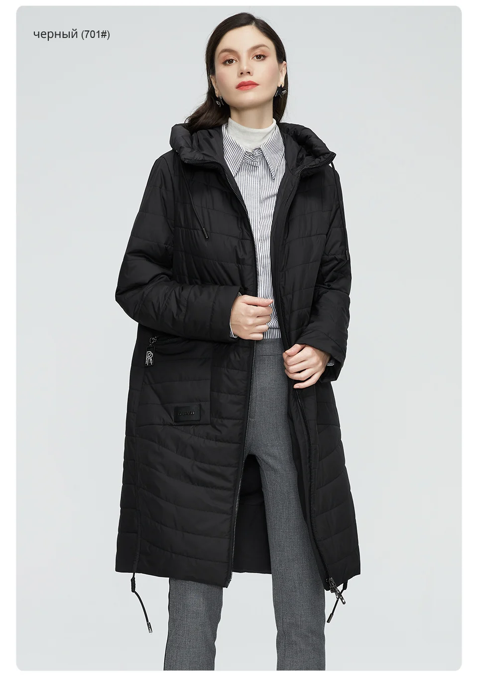 На модель ростом 159 см, (при стандартном размере L), курточку купили в размере XL. Села отлично! С размерной таблицей у продавца совпадает. Курточка сама по себе легкая, имеет наполнитель - полиэфирное волокно. Имеются по бокам вместительные, глубокие, вертикальные карманы на молнии, также есть кармашек на пуговице, внутри куртки, на подкладке. Снизу, по бокам, расположены кнопки (2 с каждой стороны), которые фиксируют разрез. Также, имеются веревочки по обеим сторонам, благодаря которым, можно затянуть и присобрать курточку по бокам. Растегнуть пальто можно, как сверху, так и снизу. Курточка идет с капюшоном. Он глубокий, но не съёмный. Фурнитура на одежде серебристая, с камушками, что придает курточке еще больше изюминки.