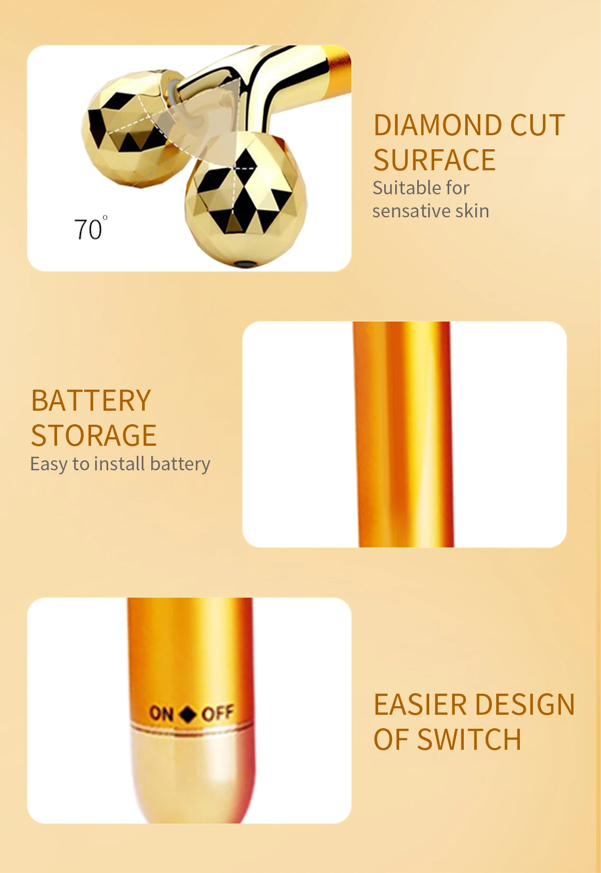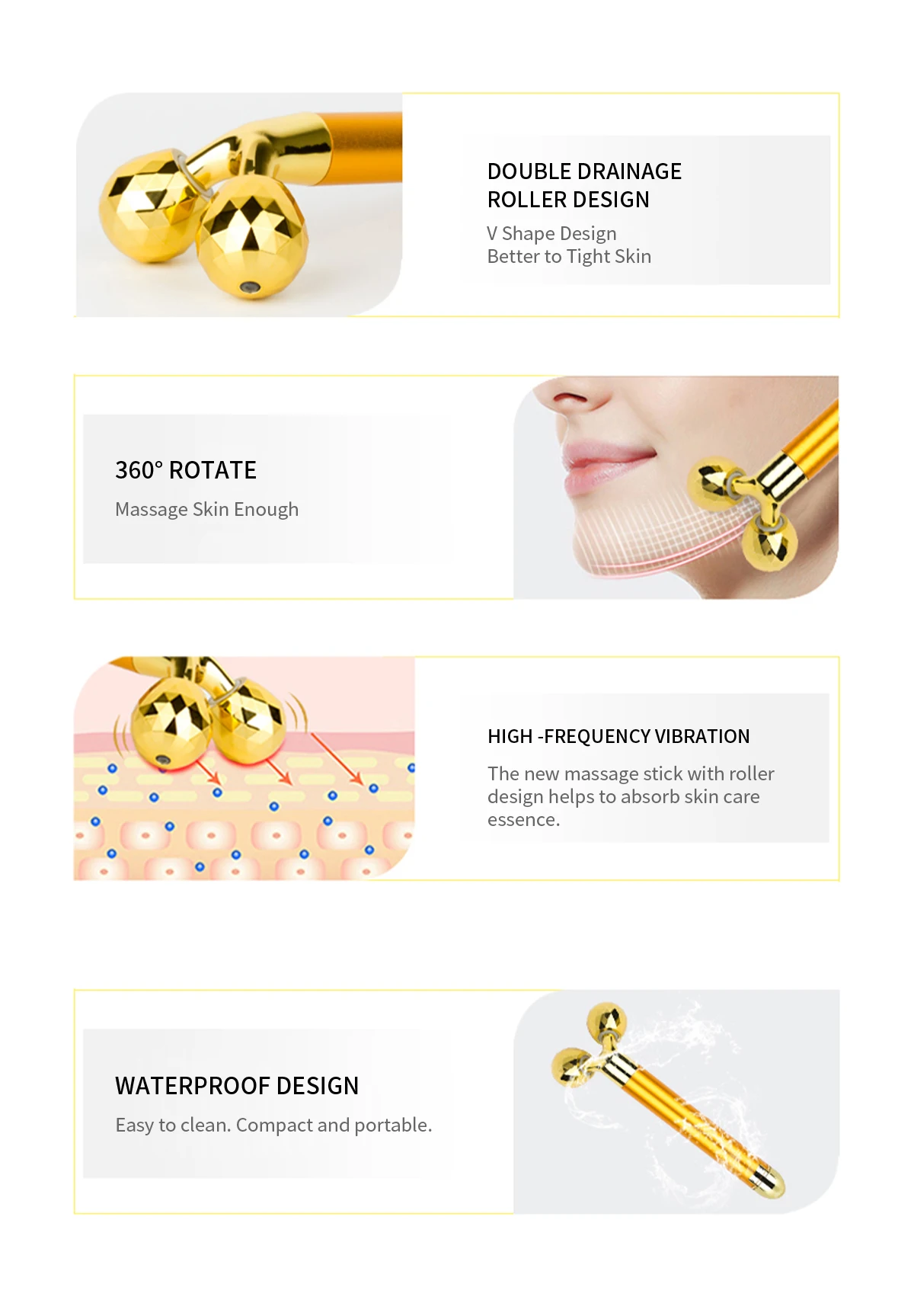 Особенности:✍【Двойной дренаж 3D роллер 】 Алмазная огранка с небольшой ромбовидной формой и уникальным дизайном 3D "V" для приспособления к каждому углу вашего лица, с двойным дренажным роликом, имитируйте массажные мастер-Комплексные методы разминания, которые могут сделать вас наслаждаться комфортом, как от спа-класса массажа, С шариками с драгоценными камнями идеально подходит для использования эфирных масел, парфюмерных масел, исцеления ✍[Инновационный дизайн v-образной формы головки] компактный и гладкий, более оптимальный контакт с кожей, активирует метаболизм клеток кожи, восстанавливает упругость и эластичность кожи, предотвращая старение, повышая иммунитет ✍【Высокочастотная Вибрация 】вибрационная Массажная терапия может поддерживать влажную и эластичную вибрацию с стабильным электрическим приводом. Требует батарейки типа АА (не прилагаются); Частота вибрации: около 6000 раз/мин ✍【Простой в использовании ролик для лица kit】поместите эфирное масло в бутылка с драгоценными камнями, сочетание двух укрепляющих роликов для лица, увеличивает кровообращение, уменьшает герметичность, морщины и омолаживает кожуОписание:✿ Каковы преимущества этого массажера?Он может расслабить ваши мышцы и тело.В сочетании с продуктами по уходу за кожей, это может повысить уровень впитывания кожи.✿Let's fight with wrinkle, dark Circle, edema-с помощью нашего 24K Golden Beauty Bar, вы наконец-то достигнете полного потенциала вашей рутины по уходу за кожей и быстро достигнете сияющей, светящейся кожи3D 3D роликовый массажер для лица3D Водонепроницаемый ролик с поворотом на 360 градусов, который подчеркивает всю кожу тела.Y Форма и малый размер, с новой технологией разминания, способствует подтягиванию кожи, коррекции фигуры и улучшает кровообращение, снимает напряжение.Может использоваться с косметикой для массажа, способствует лучшему впитыванию продуктов по уходу за кожей.✍ПитаниеТребуется одна батарейка AA (не входит в комплект); Частота вибрации: около 6000 раз/минуту включение/выключение, высокая частота 6000 вибраций, чтобы уменьшить гордость на лице и создать привлекательный профиль лица.✌Идеальный подарок:Это может быть значимый подарок для пожилых, мам, бабушек, жены, дочери, сестры. Рекомендуется охладить массажер перед использованием, чтобы помочь улучшить производительность и получить лучшие результаты. Кроме того, его можно использовать в банях и саунах для улучшения кровообращения лица.Посылка включает в себя:3D 1 x 3D роликовый массажер для лица (батарея в комплект не входит)✿ Руководство по эксплуатации на английском языке-1 шт.Packing упаковочная коробка-1 шт.