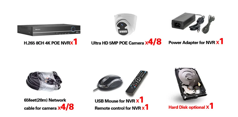 1 сетевой видеорегистратор 8CH 4K POE NVR;4/8 X HD POE IP 5.0MP Крытый Открытый ИК камеры дневного ночного видения;4/8X65 футов (20 м) сетевой кабель для камеры;1 X Блок питания для NVR;1 х USB мышь для NVR;1 компакт-диск программного обеспечения для NVR;1 пульт дистанционного управления для NVR;Жесткий диск опционально!