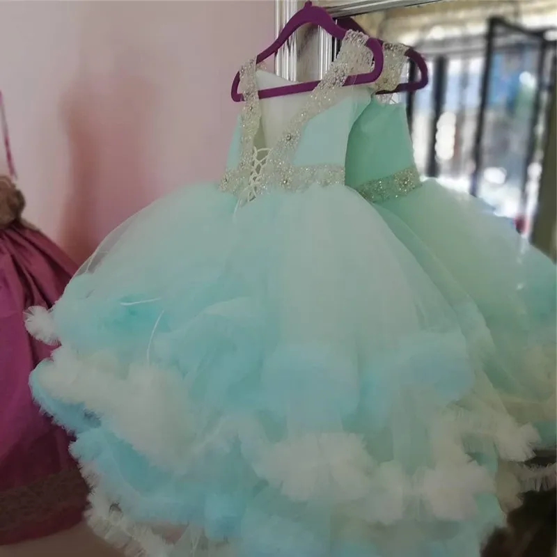 Реальное изображение на заказ, небесно-голубые пышные платья с цветами для девочек, детское платье для вечеринки, торжества, дня рождения