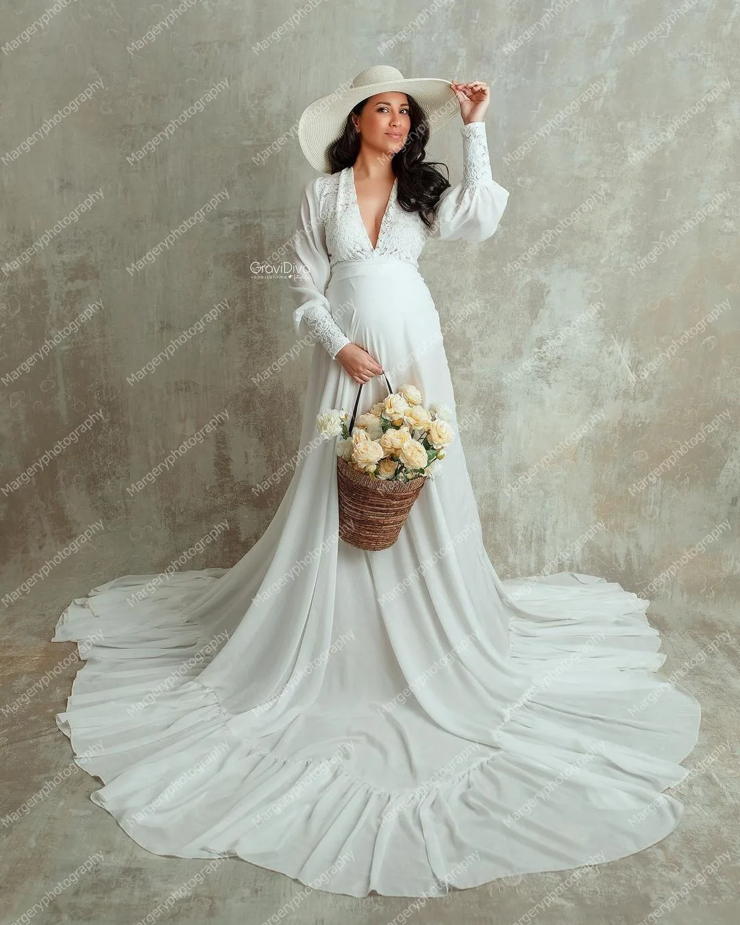 Очаровательные Белые платья для фотосессии, белые кружевные шифоновые платья с длинным шлейфом и V-образным вырезом и длинными рукавами для беременных женщин