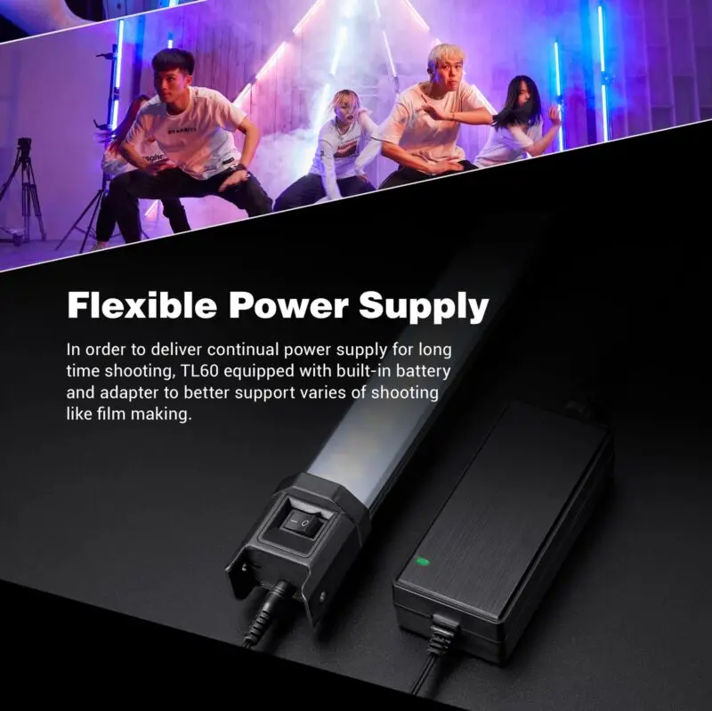 Технические характеристики Модель TL60 Встроенный литиевый аккумулятор питания 14,4 V/2600mAh литиевая батарея Выход адаптера 20V2.4A Максимальная мощность 18 Вт Канал 32 Группа 6 групп (ABCDEF) Диапазон цветовой температуры 2700K ~ 6500K Диапазон затемнения 0% ~ 100% Цветовая гамма RGB 0 ~ 360 ° 100% освещенность (люкс) (=) 1500 CRI() 96 TLCI(1) 98 Время непрерывного использования 120 минут Метод управления мобильное приложение/2,4G беспроводной пульт дистанционного управления/DMX контроль Дистанция беспроводного управления Bluetooth 30 метров 2.4 дистанции беспроводного управления ~ 50 метров (дистанционное управление RC-R9 приобретено отдельно) Температура рабочей среды-10 ~ 40 ° c Размер изделия 48*750 мм Вес 0,73 кг