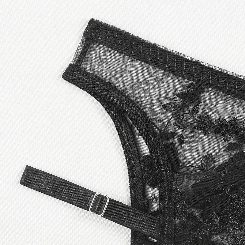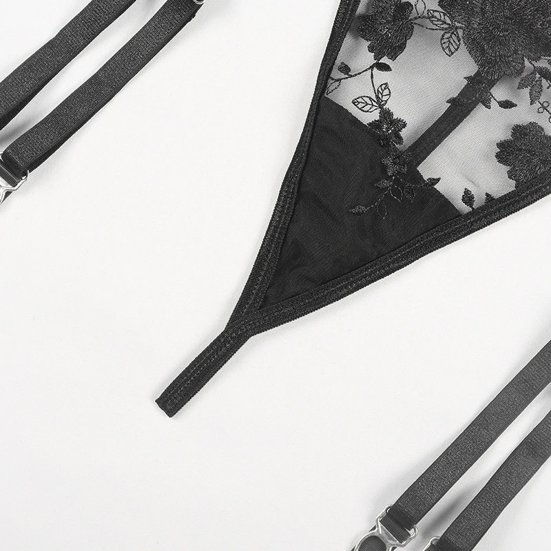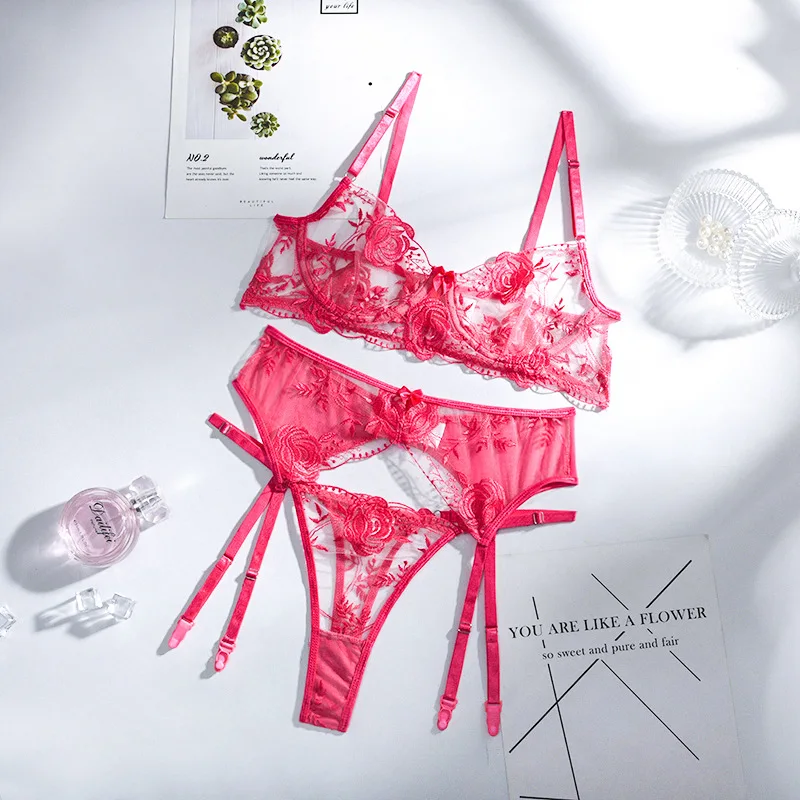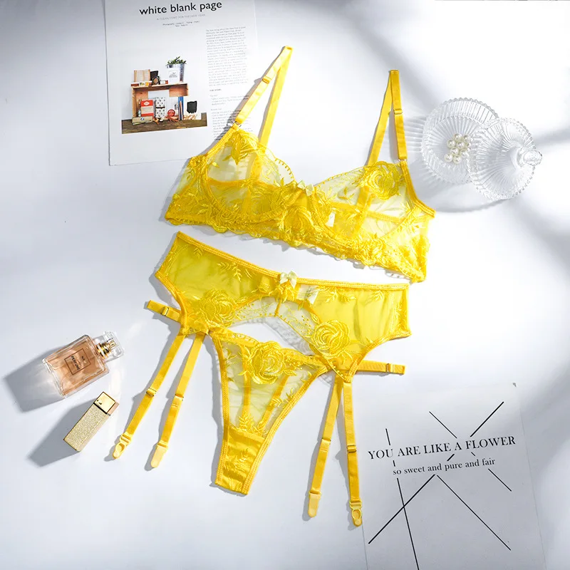 Сексуальное женское нижнее белье, тонкий прозрачный кружевной комплект с бюстгальтером пуш-ап, бюстгальтер с вышивкой + подвязки + стринги, комплект из 3 предметов