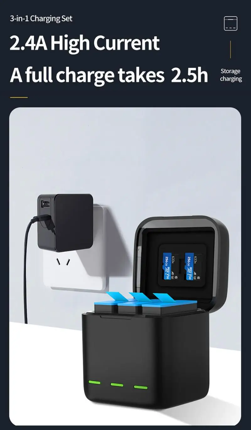 【 3-канальное зарядное устройство 】 3-канальное мини USB зарядное устройство для GoPro Hero 9 черного цвета, может одновременно заряжать до 3 батарей, также предназначен в качестве ящика для хранения ваших батарей.