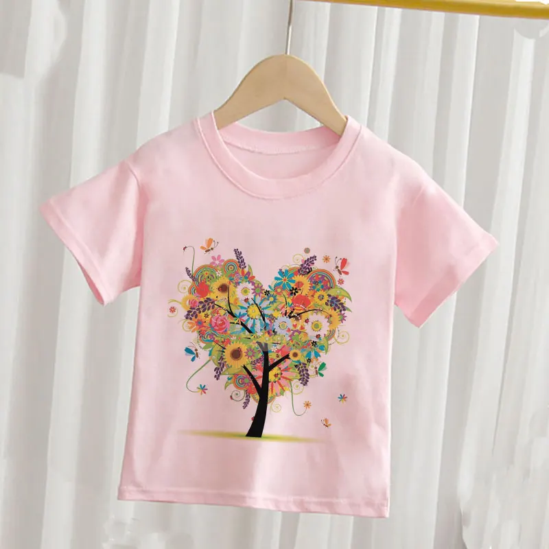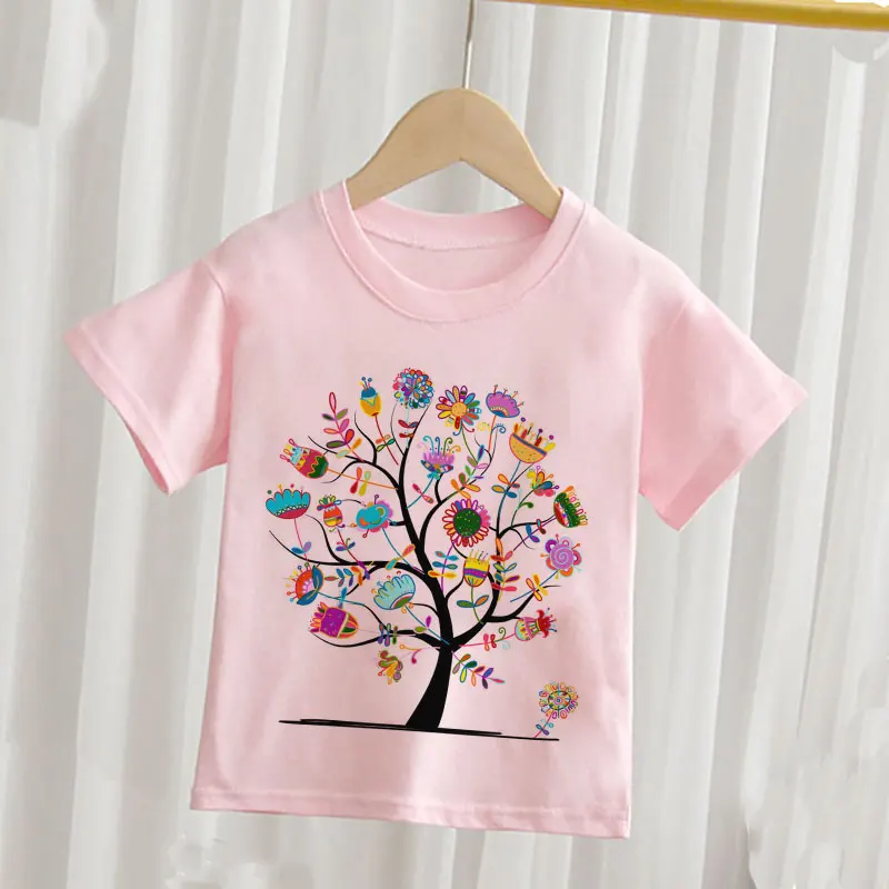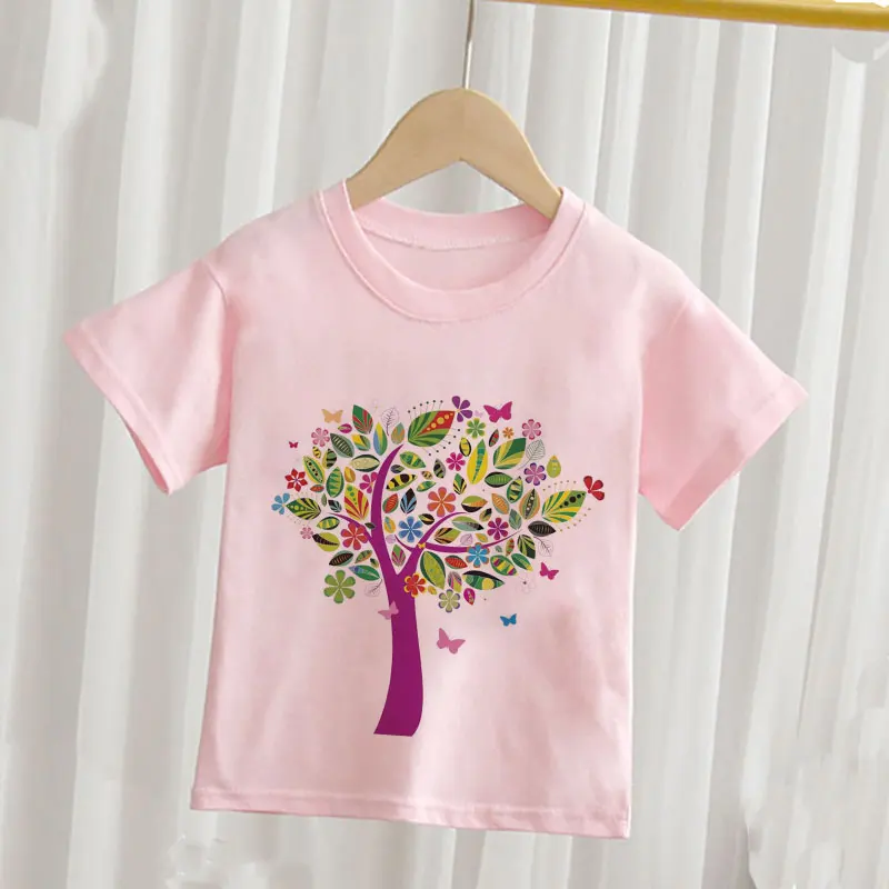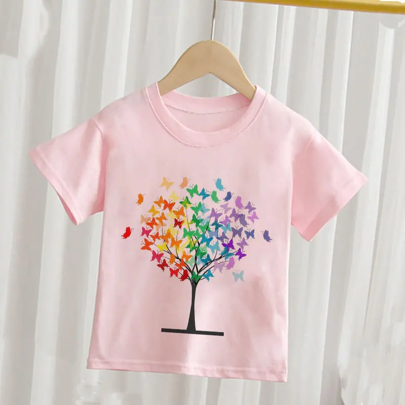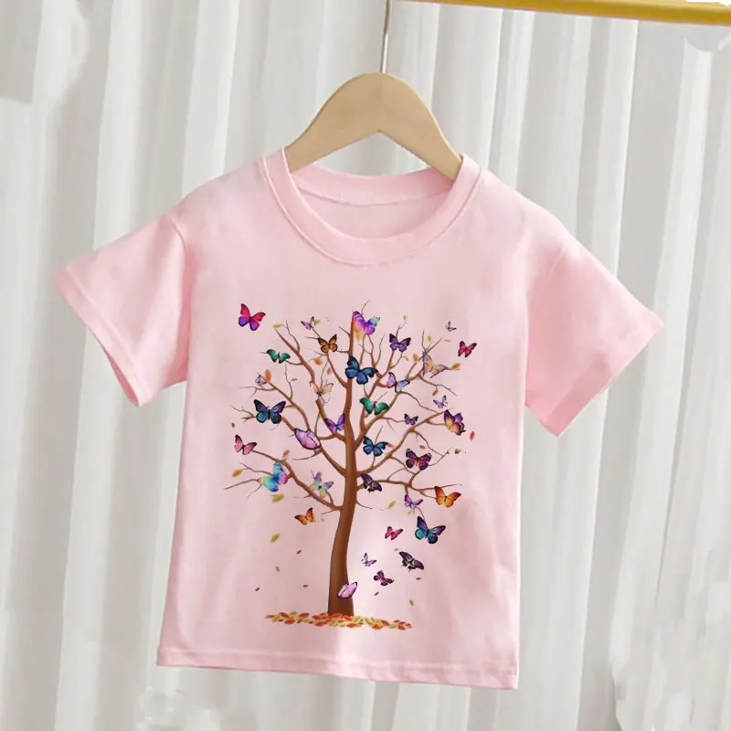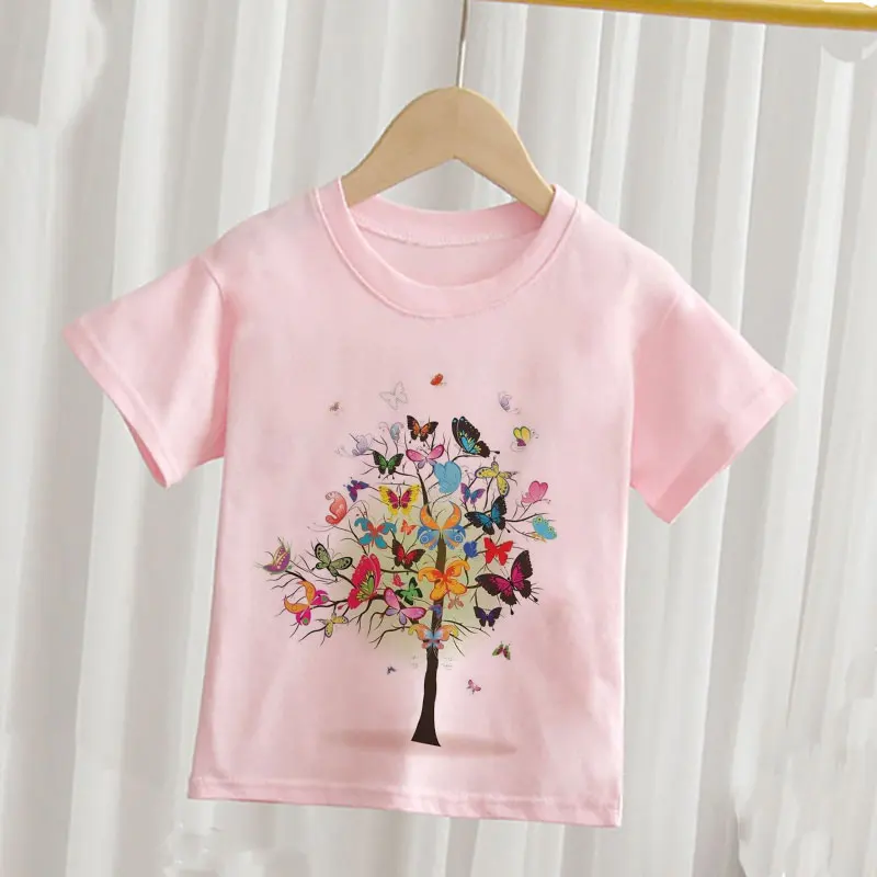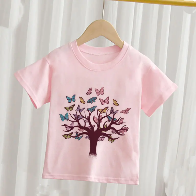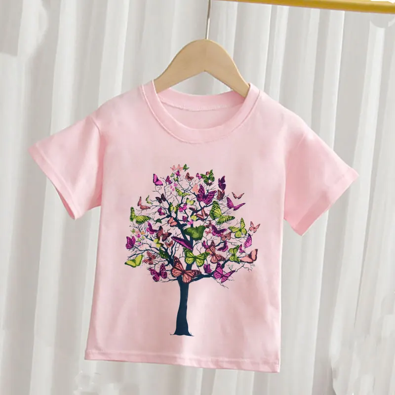 Футболка для мальчиков и девочек, летняя футболка с волшебными бабочками, растениями, деревьями, топы, одежда для малышей, детская одежда, мультяшный розовый с коротким рукавом