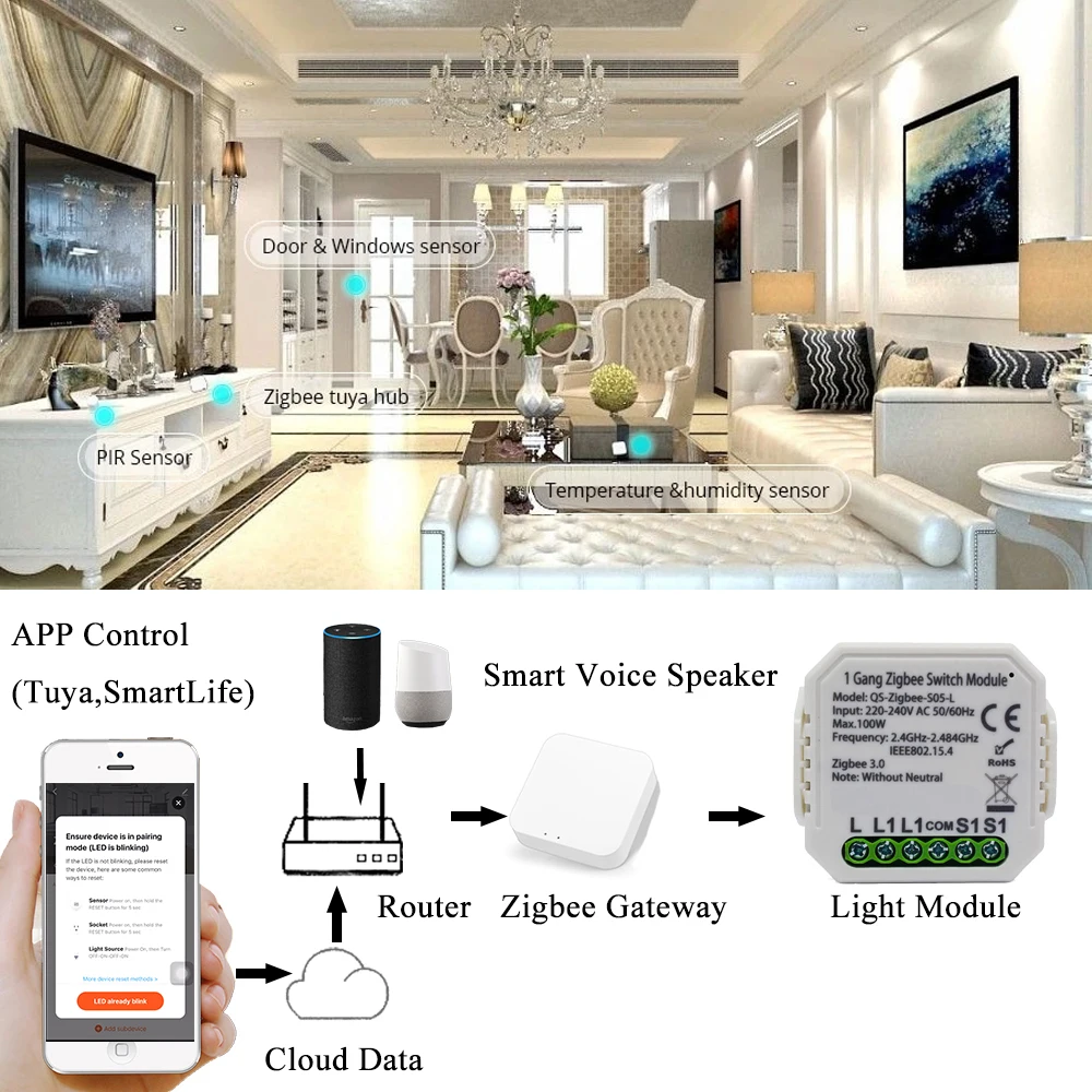 О модуле Zigbee светильник: Этот умный модуль Tuya ZigBee 3,0 разработан специально с протоколом ZigBee 3,0, совместим с Tuya ZigBee hub (также поддерживается SmartThings) для реализации всей связи вашего дома, действительно хорошая замена нестабильного Wi-Fi. Мини-размер, подходит для Великобритании/ЕС. Он также поддерживает 1way 2way(2 переключателя управления 1 светильник) Подключение. Голосовое управление, дистанционное управление с помощью приложения, работа с традиционным переключателем, функция времени, Семейный доступ, он мощный и полезный. Конечно, вам сначала нужен концентратор zigbee/шлюз. Вы также можете найти его в нашем магазине.