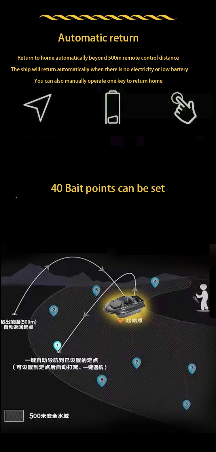 Основная особенность: 1. Гироскоп стабилизирует корпус, автоматически корректирует скорость, чтобы держать вождение в прямой линии под ветром и волнами. 2. С грузоподъемностью 2.5 кг. 3. Высокочастотный беспроводной пульт дистанционного управления, одноблочный одночастотный, не беспокойтесь о помехах сигнала. 4. После того, как Приманка будет введена, двигатель автоматически выключится, чтобы не повредить рыбу. 5. Полностью закрытый корпус, многослойная закрытая конструкция для предотвращения утечки корпуса 6. Расстояние дистанционного управления составляет 500 метров, и корабль будет автоматически возвращен, когда нет мощности, потери сигнала или более 500 метров 7. Светодиодный светильник может ловить рыбу ночью и притягивать рыбу